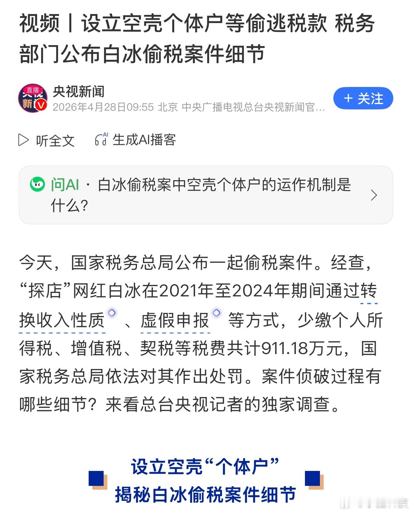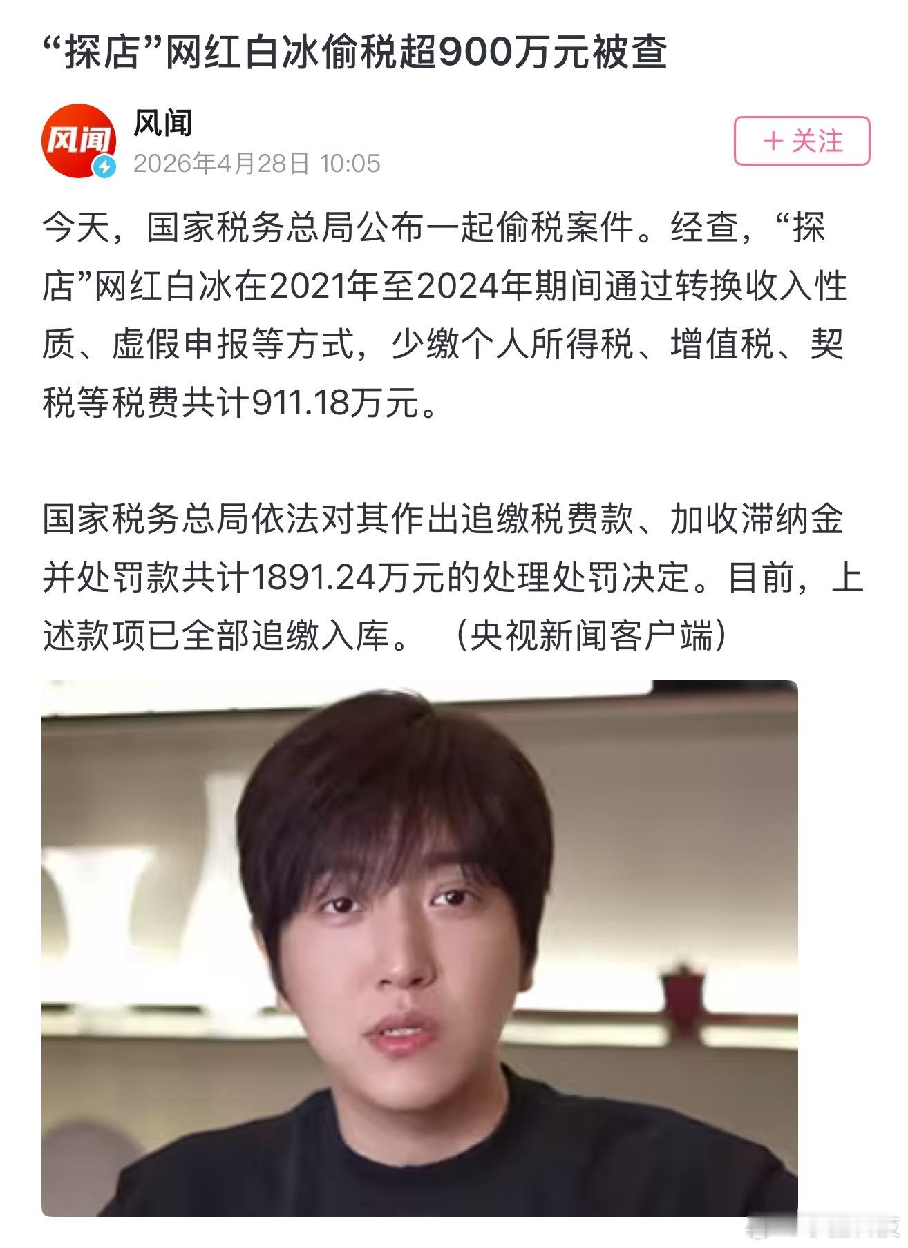 网红白冰偷税911.18万弹出新闻那一刻还挺震惊,没想到这哥们也翻车了。他做探店也很久了,四千多万粉丝,应该不差这900万,糊涂啊,为了偷漏这么点税损失巨大。这也证明了金四时期,所有不合规避税手段都逃不过法眼。