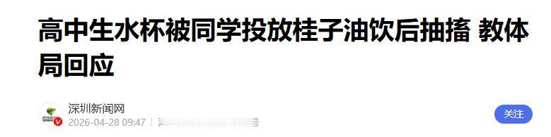 湖南,一高三生教室饮水后突发抽搐、倒地不起,浑身刺痛、言语含糊,吓坏全班同学!经查竟是同班同学恶意投加桂子油,这款气味清甜、极易藏匿的“隐形凶器”,竟能引发呼吸性碱中毒,家长得知真相后怕到发抖... 很多人对桂子油的认知,停留在“似香料、像药材”的表面,甚至被它的糖果味所迷惑,却不知这看似普通的小东西,有着极强的刺激性。 它是从肉桂树的树皮和枝叶中提取的高浓度提取物,核心成分肉桂醛具有强烈的腐蚀性,哪怕只是滴一滴在舌头上,也会带来砂纸打磨般的刺痛,一旦误服,会直接灼伤喉管,引发过度换气,导致血液酸碱度失衡,进而诱发呼吸性碱中毒,严重时还可能损伤肝肾功能,带来不可逆的伤害。 更让人揪心的是,它的隐蔽性极强。 没有刺鼻的异味,反而带着清甜的香气,装在普通的小瓶子里,体积小巧到能轻松揣进衣兜,无论是校园门口的检查,还是教室裡的日常看管,都很难发现它的踪迹。 这种“易携带、难察觉”的特点,让它轻易避开校园管控,成为别有用心之人的伤人工具。 4月27日,湖南岳阳一所高中的教室内,这场隐藏在水杯里的伤害悄然发生。 一名高三学生课间拿起水杯,喝下一口水后,身体瞬间出现异常。 起初是喉咙传来火烧般的刺痛,紧接着头痛难忍,浑身不受控制地抽搐,脸色苍白如纸,想说话却只能发出含混不清的声音,整个人直直倒地。 教室里的同学被这突如其来的一幕吓得尖叫,所有人都懵了,眼睁睁看着熟悉的同学在自己面前陷入危险,却手足无措。 老师发现后,第一时间冲進教室,紧急将这名学生送往医院救治。 经过医生诊断,该学生确诊为呼吸性碱中毒,而导致这一切的,正是他喝下的那杯水里被人偷偷添加的桂子油。 后续通过监控查证,投放桂子油的不是外人,正是他的同班同学,这名涉事学生趁着下课教室无人的间隙,悄悄将桂子油倒入了受害者的水杯中。 事发时,距离高考仅剩一个多月,这名受害学生正处于紧张的备考冲刺阶段,突如其来的伤害,不仅让他身体遭受痛苦,更打乱了他的备考节奏,影响了他的身心状态。 受害学生的家长得知事情真相后,气愤不已,更后怕到浑身发抖,他们难以想象,自己每天精心给孩子灌满的水,送到学校后,竟会被孩子熟悉的同学动了手脚,更难以接受,一款看似普通的小东西,能带来如此大的伤害。 客观来说,涉事学生的行为绝对不可原谅,无论其动机是追求刺激,还是单纯觉得“好玩”,往别人的水里添加有害物质,都是漠视他人生命健康的表现,这不是“犯错”,而是触碰了做人的底线,甚至可能触犯法律。 校园教育不能只盯着分数,更要教会孩子敬畏生命、尊重他人,这比任何成绩都重要。 长期以来,校园管控大多聚焦于刀具、火种等明显的危险品,却对桂子油这类看似“日常”、实则有强刺激性的物品缺乏足够的防范意识,没有及时更新危险品清单,也没有开展相关的安全宣传,才给了别有用心之人可乘之机。 校园安全的网眼需要织得更密,不能放过任何一种潜在风险,哪怕是看似无害的小众物品,也该纳入管控范围。 除此之外,很多家长也需要反思。 平日里,大多数家长只关注孩子的学业成绩,反复叮嘱孩子好好复习、考上好大学,却忽略了对孩子的安全教育,也没有提醒孩子留意身边的人和事,更没有教会孩子如何防范身边的潜在危险,比如妥善保管自己的水杯、不接受陌生人的食物,甚至不轻易让同学触碰自己的个人物品。 目前,事件还在进一步协商处理中,投放异物的学生最终会受到怎样的处理,尚未有明确结果。 但这件事给所有学校、家长和学生都敲响了警钟:校园从来都不是绝对安全的“避风港”,人心的恶意往往藏在细微之处,那些看似无害的小东西,随时可能成为伤人的工具。 我们不能再抱有“校园安全无需担心”的侥幸心理,也不能再只注重成绩而忽视品行教育和安全教育。 唯有学校筑牢管控防线,家长做好引导提醒,学生树立自我保护意识,才能真正守护好每一位学生的安全,让校园成为真正适合学习、成长的地方。 信息来源: 深圳新闻网 2026年4月28日 《高中生水杯被同学投放桂子油饮后抽搐 教体局回应》