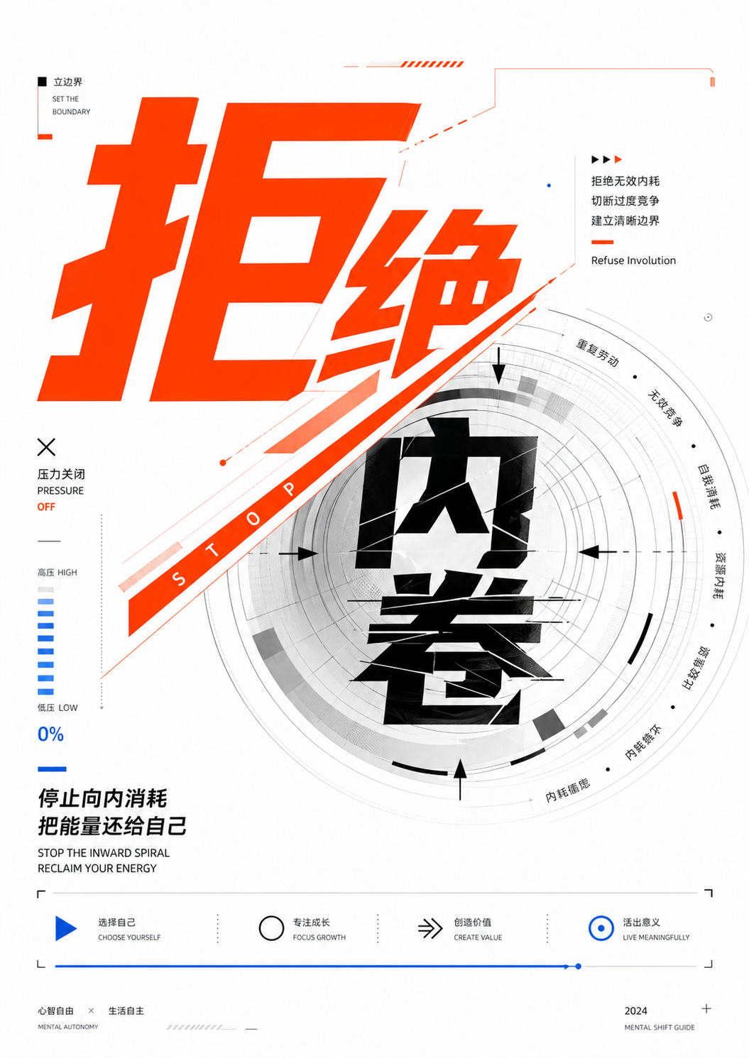 请先真正理解用户输入内容的字面含义、情绪气质、隐含象征、文化联想、心理感受、语义张力,并判断它更偏向哪一类主题:如果是情绪型,例如孤独、自由、热烈、焦虑、松弛、压抑、浪漫、冷漠,请重点通过色块关系、留白比例、图形距离、方向感、密度变化、视觉重心来表达;如果是动作型,例如逃离、靠近、坠落、生长、爆发、旋转、流动、停滞,请重点通过几何运动轨迹、字体切割与错位、方向线条、模块推进关系、斜向构图和速度感来表达;如果是关系型,例如连接、对抗、平衡、依赖、分裂、共生、拉扯、融合,请重点通过两个或多个主体之间的距离、重叠、分离、嵌套、包裹、对称、失衡、碰撞、交错、连接节点和中介结构来表达;如果是抽象概念型,例如时间、秩序、边界、记忆、命运、欲望、真相、规则、偏见,请先找到一个简洁但具体的视觉隐喻,再通过系统感排版、网格变化、遮挡、偏移、层级结构、模块重复与变化来表达;如果是具象物象型,例如火焰、种子、月亮、桥梁、岛屿、风、镜子,不要直接画成写实插图,而应将其提炼为符号化、几何化、排版化、结构化的视觉表达。