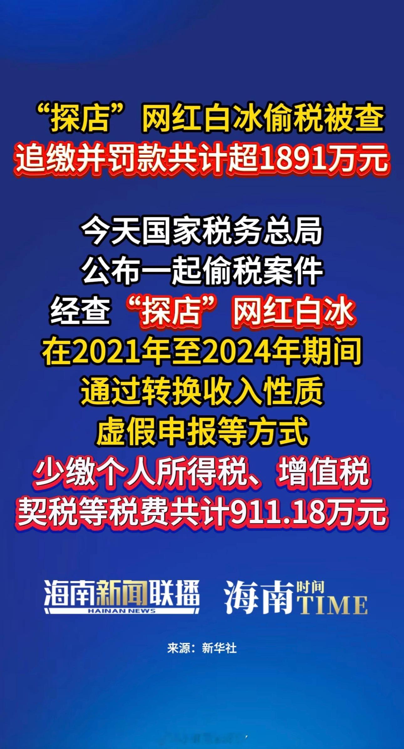 网红白冰偷税911.18万我的天、他很火的、我就搞不懂都那么火了为什么要自寻绝路啊、好好交税继续赚钱不好吗?逃了被发现不还是要补上然后还塌了不能再继续赚了、那不是得不偿失、千万不要抱着侥幸心理啊