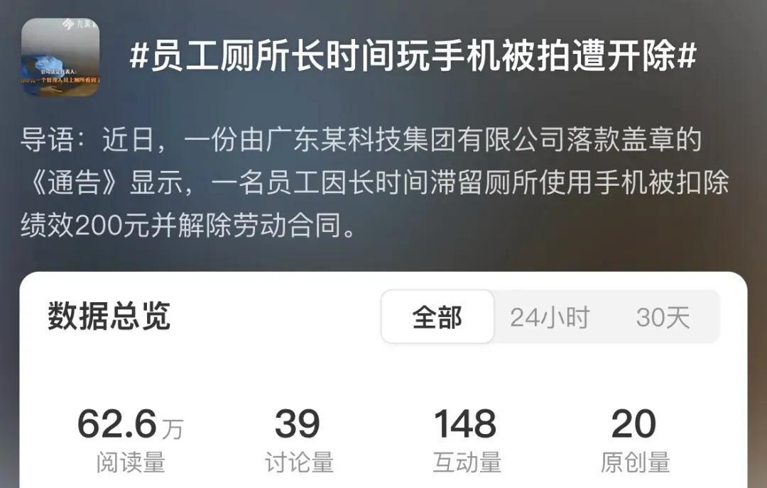 员工“带薪拉屎”被开除,这事确实令人很难评。广东这两天曝出一件大批打工人都可能碰到的事,一名员工因长期滞留厕所玩手机被开除。关键不是事件结果,长期无辜离岗被处罚无可厚非,问题是这家公司拿出的证据让人不齿。 从公司发出来的处罚通告上,赫然贴上了该员工如厕的照片,此举瞬间让人炸毛。多数人第一感觉,就是曾经的“计时如厕”、“厕所监控”重出江湖了。为了避免员工长时间摸鱼,不少公司采取一些非常手段,比较高级的用智能办公椅或坐垫远程监测员工离开时间,低级的就是用这种公开羞辱式的方式让人难堪。 说实在的,公司为了效益和业绩,这年头尤其是私营企业,生存都不容易,老板和股东自然恨不得员工把上班当成事业打拼,可员工呢就为了一份工资打卡上班,事多活重当然也会想方设法偷懒。这本身就是一个难以调和的矛盾,除非老板给的够多,像胖东来那样的企业万不存一。 眼见事情闹大,公司老板称没有厕所监控,是有管理员从厕所缝隙拍到的。但不管真假,广东这家公司这么干肯定是违法的。即便没有完美的解决办法,这种公然侵犯人格的做法,都是下下策。