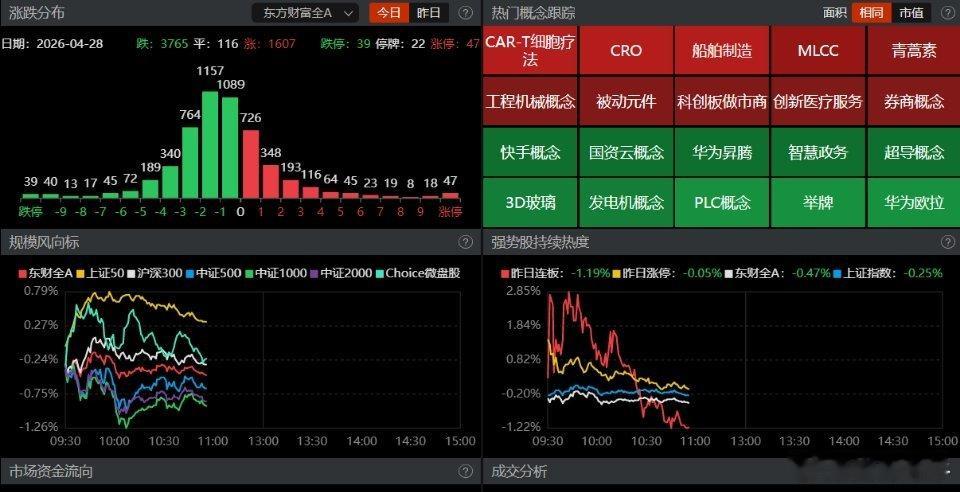 上午市场整体呈现低开弱势震荡,几大主要指数悉数下跌,其中创业板 深成指下跌近1%,上证指数围绕4080一带弱势震荡。微盘股指数冲高回落,跌至平盘线附近,中证2000低开低走调整幅度加大,大小盘指数同步承压,两市下跌家数超过3700家,情绪面趋于谨慎偏冷。