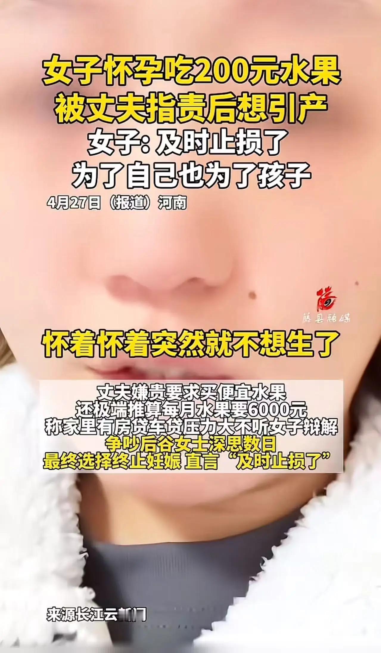 女子怀孕吃不饭,买了200元水果,遭丈夫辱骂“败家”后想引产!女子:决定及时止损,为了自己也为了孩子! 女子怀孕吃不下饭,买200元水果遭丈夫辱骂败家,心寒欲引产:及时止损,放过自己 怀胎十月,本是女人一生最辛苦也最该被呵护的一段时光。身体激素紊乱、孕吐反胃、吃不下饭、浑身乏力,每一位孕妈都在默默承受常人无法体会的煎熬。 可现实里,不是所有孕妇都能被温柔以待。有的女人怀着身孕,还要忍受伴侣的冷漠、计较与苛责,一点点微薄的诉求,在对方眼里都成了奢侈和浪费。近日,一位孕期女子的经历戳痛无数网友的心,也撕开了无数普通家庭里,最真实的婚姻痛点。 这位女子自从怀孕之后,孕期反应格外强烈。整日恶心反胃,油腻的饭菜一口都咽不下去,主食更是难以下咽,长时间吃不下东西,整个人日渐消瘦,身体状态越来越差。 为了补充营养,也为了能让自己稍微有一点食欲,女子思来想去,咬牙买了200块钱的新鲜水果。各式各样的时令水果,软糯易消化,既能缓解孕吐不适,也能给肚子里的孩子补充维生素和营养,在她看来,这是孕期最基础、最合理的开销。 可万万没想到,就这区区200元的水果,却彻底点燃了丈夫的怒火。丈夫看到购物账单和一堆水果后,当场大发雷霆,对着怀孕的妻子肆意辱骂,字字句句都极尽刻薄,直言她太过败家、不懂节俭,只会乱花钱,完全不懂得体谅赚钱的辛苦。 丈夫只顾着计较两百块的花销,全程没有问过一句妻子身体难不难受,有没有好好吃饭,怀孕熬得辛不辛苦。在他眼里,妻子孕期的不适不值一提,孕妇需要补充营养是矫情,花钱善待自己就是过错。 冷冰冰的指责,刺骨的言语,瞬间击溃了女子所有的期待。怀胎的辛苦、身体的折磨,她都咬着牙默默扛下,本以为婚姻是依靠,丈夫是后盾,到头来才发现,自己不过是孤身一人。 一瞬间,满心的委屈和心寒涌上心头。女子看着眼前冷漠又吝啬的丈夫,彻底心死,甚至动了引产、结束这段婚姻的念头。 很多人看到这里或许会不解,不过是两百块水果,不至于走到引产离婚的地步。但只有身处其中的人才明白,压垮一段婚姻的,从来都不是一件小事,而是无数次的忽视、算计和冷漠堆积而成的失望。 两百块只是导火索,真正让她绝望的,是丈夫骨子里的自私。他心疼几百块钱,却不心疼身怀六甲的妻子;他精打细算过日子,却不愿为妻儿多一分包容和付出;他要求妻子勤俭节约、委屈将就,却忘了怀孕本身就是一场巨大的付出与牺牲。 婚姻里最可怕的贫穷,从来不是物质上的拮据,而是精神上的冷漠和情感上的匮乏。过日子需要节俭没错,但节俭不能以委屈妻子、亏欠孩子为代价,更不能消耗身边人的身心健康。 女子事后坦言,自己想要引产、选择离开,不是一时冲动,而是深思熟虑后的及时止损。勉强凑活的婚姻,带给孩子的不是温暖的家,而是压抑冰冷的成长环境。与其让孩子出生后,在父母矛盾、家庭内耗里长大,让自己一辈子困在委屈里,不如趁早放手。 好的婚姻,一定是互相体谅、彼此珍惜。懂得包容对方的不易,心疼对方的付出,愿意为彼此让步。一个连你孕期温饱都要算计的人,很难在往后的岁月里,为你遮风挡雨。 婚姻需要烟火气,但不能只剩斤斤计较。愿每一位孕妈都能被温柔善待,愿所有人都明白,好好爱人,好好善待家人,才是一个家庭最好的风水。 怀孕后悔 孕期厌食 怀孕离谱行为 孕期羞辱 孕妈语录 孕妈妈跳楼 自私孕妇