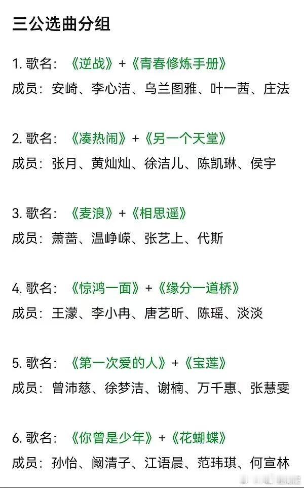 网传浪姐三公分组曲目浪姐三公分组选歌 浪姐三公分组选歌1. 歌名: 《逆战》+《青春修炼手册》 成员: 安崎、李心洁、乌兰图雅、叶一茜、庄法2. 歌名: 《凑热闹》+《另一个天堂》 成员: 张月、黄灿灿、徐洁儿、陈凯琳、侯宇3. 歌名: 《麦浪》+《相思遥》 成员: 萧蔷、温峥嵘、张艺上、代斯4. 歌名: 《惊鸿一面》+《缘分一道桥》 成员: 王濛、李小冉、唐艺昕、陈瑶、淡淡5. 歌名: 《第一次爱的人》+《宝莲》 成员: 曾沛慈、徐梦洁、谢楠、万千惠、张慧雯6. 歌名: 《你曾是少年》+《花蝴蝶》 成员: 孙怡、阚清子、江语晨、范玮琪、何宣林