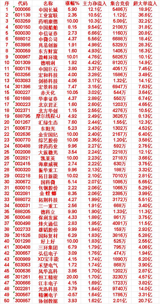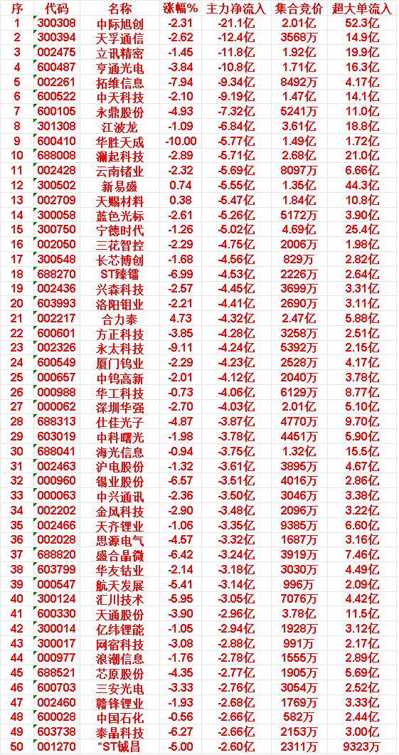 4月28日上午盘,主力趁低位,大幅买入50名单: 中国长城:上涨 5.90%,主力资金净流入 12.1亿元, 工业富联:上涨 2.35%,主力净流入 10.5亿元, 药明康德:涨停(+10.00%),主力净流入 10.3亿元, 中国船舶:大涨 8.15%,主力净流入 9.54亿元, 中信证券:上涨 2.73%,主力净流入 6.66亿元, 4月28日中午收盘,主力资金“大幅卖出”的50名单: 中际旭创:主力资金净流出21.1亿元,但超大单资金流入高达52.3亿元。 天孚通信:主力资金净流出12.4亿元,超大单资金流入14.9亿元。 立讯精密:主力资金净流出11.8亿元,超大单资金流入19.9亿元。 亨通光电:主力资金净流出10.8亿元,超大单资金流入16.3亿元。 拓维信息:主力资金净流出9.34亿元,超大单资金流入4.17亿元。
