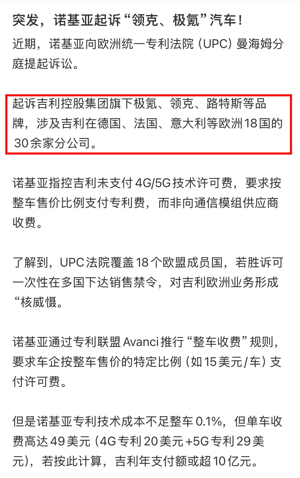 活久见! 诺基亚怎么把吉利给告了? 在我们印象中 诺基亚和吉利是八竿子打不着的两个企业 怎么诺基亚把吉利给告了 事情是这样的 诺基亚把吉利旗下的极氪 领克 路特斯等品牌 涉及在欧洲30余家分公司告了 理由是吉利未支付4G和5G技术许可费