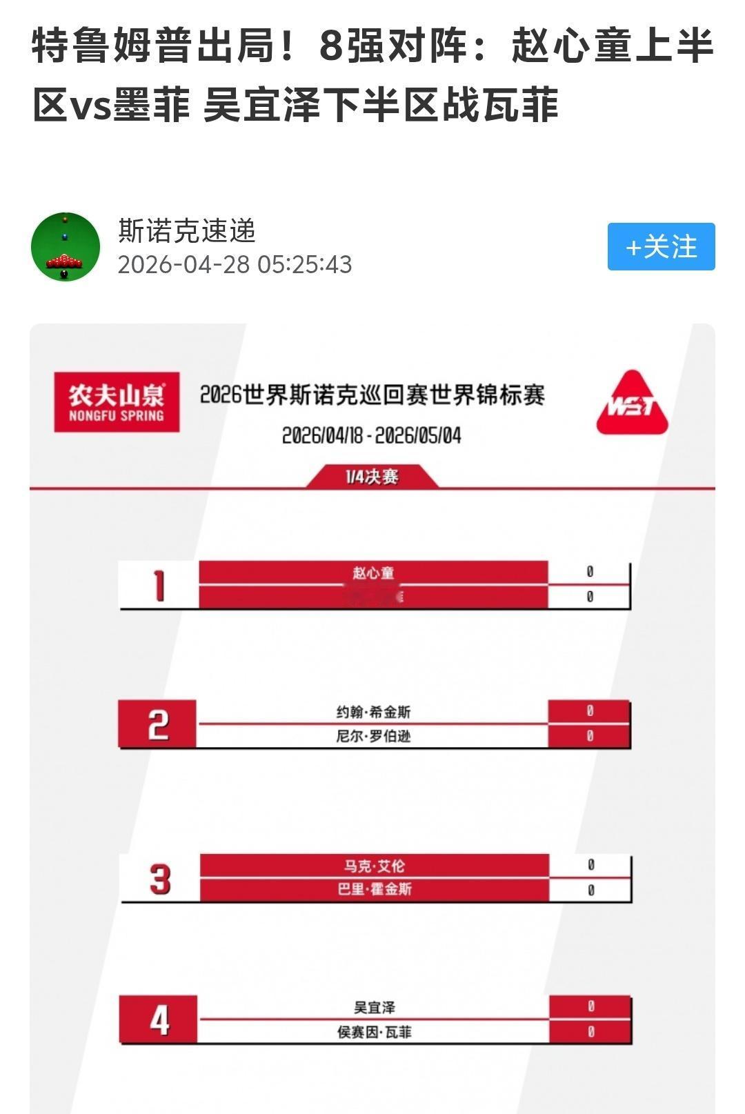 奥沙利文被淘汰,塞尔比被淘汰,如今特鲁姆普被淘汰,这届斯诺克世锦赛真的太惨烈了,竟然三位多次拿过世锦赛冠军的选手都没进8强,反而是中国两位选手吴宜泽和卫冕冠军赵心童双双进入8强,而且在两个半区,期待两个人可以一起进入决赛!