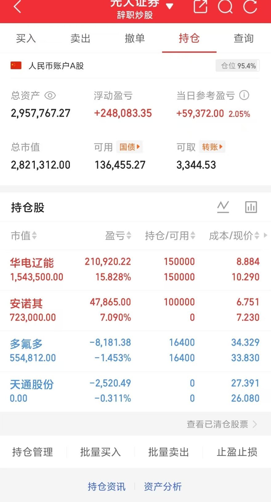今天持仓:华电辽能 持仓安诺其 上车天通股份 下车 多氟多 持仓