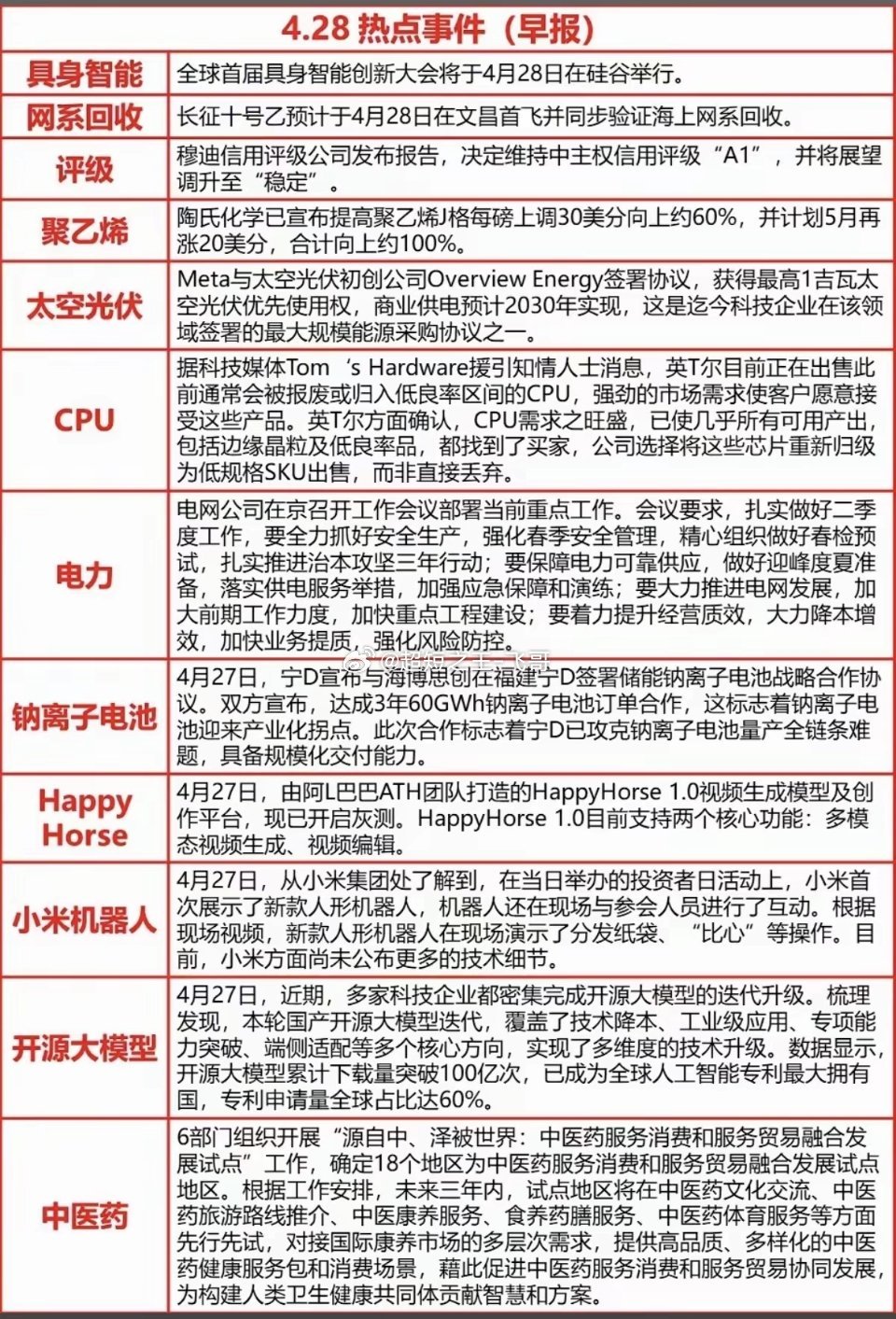 4.28周二 财经热点信息汇总!1.具身智能2.聚乙烯涨价3.太空光伏4.CPU需求爆发,供应紧缺5.钠离子电池6.小米机器人7.来源大模型8.中医药