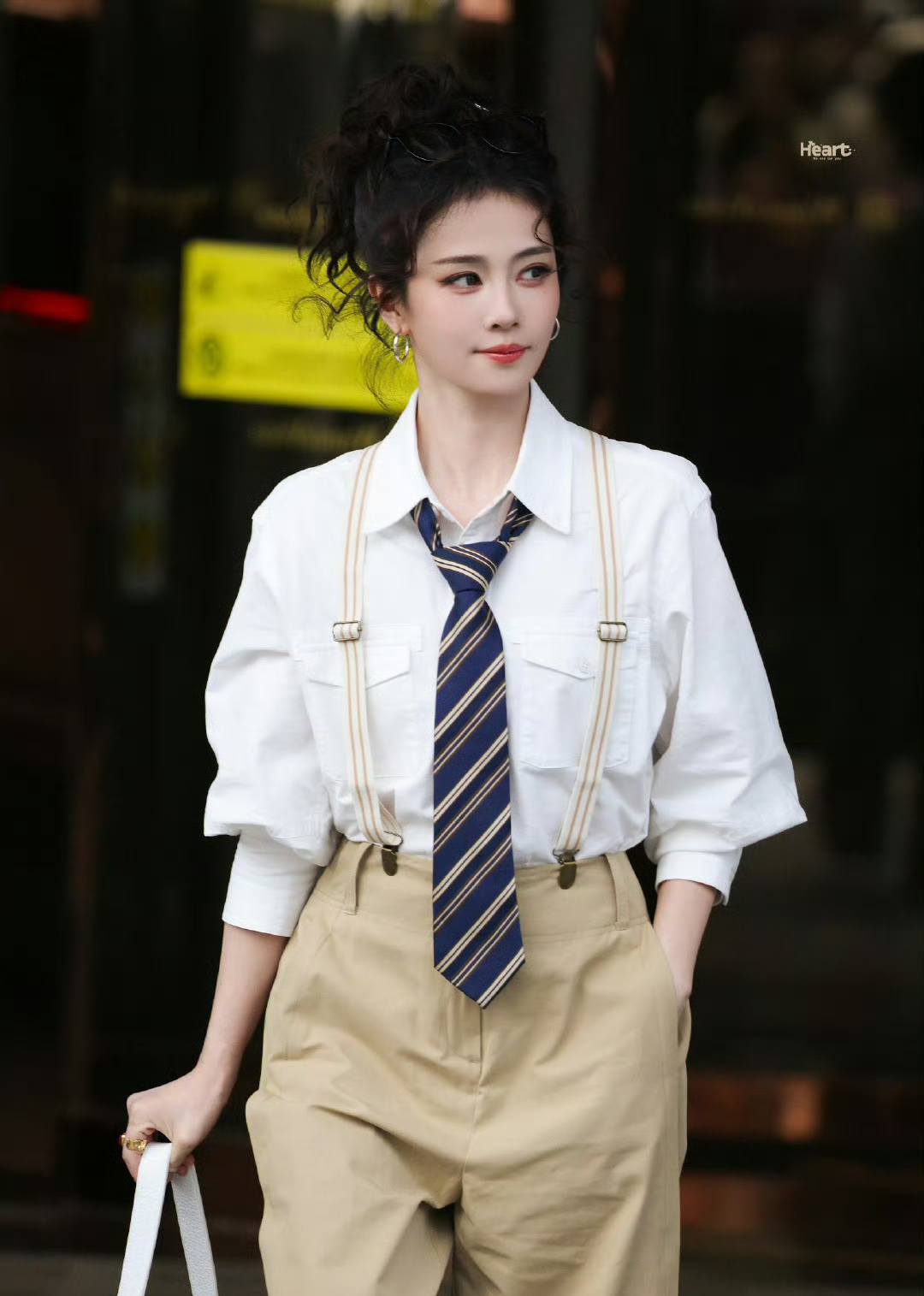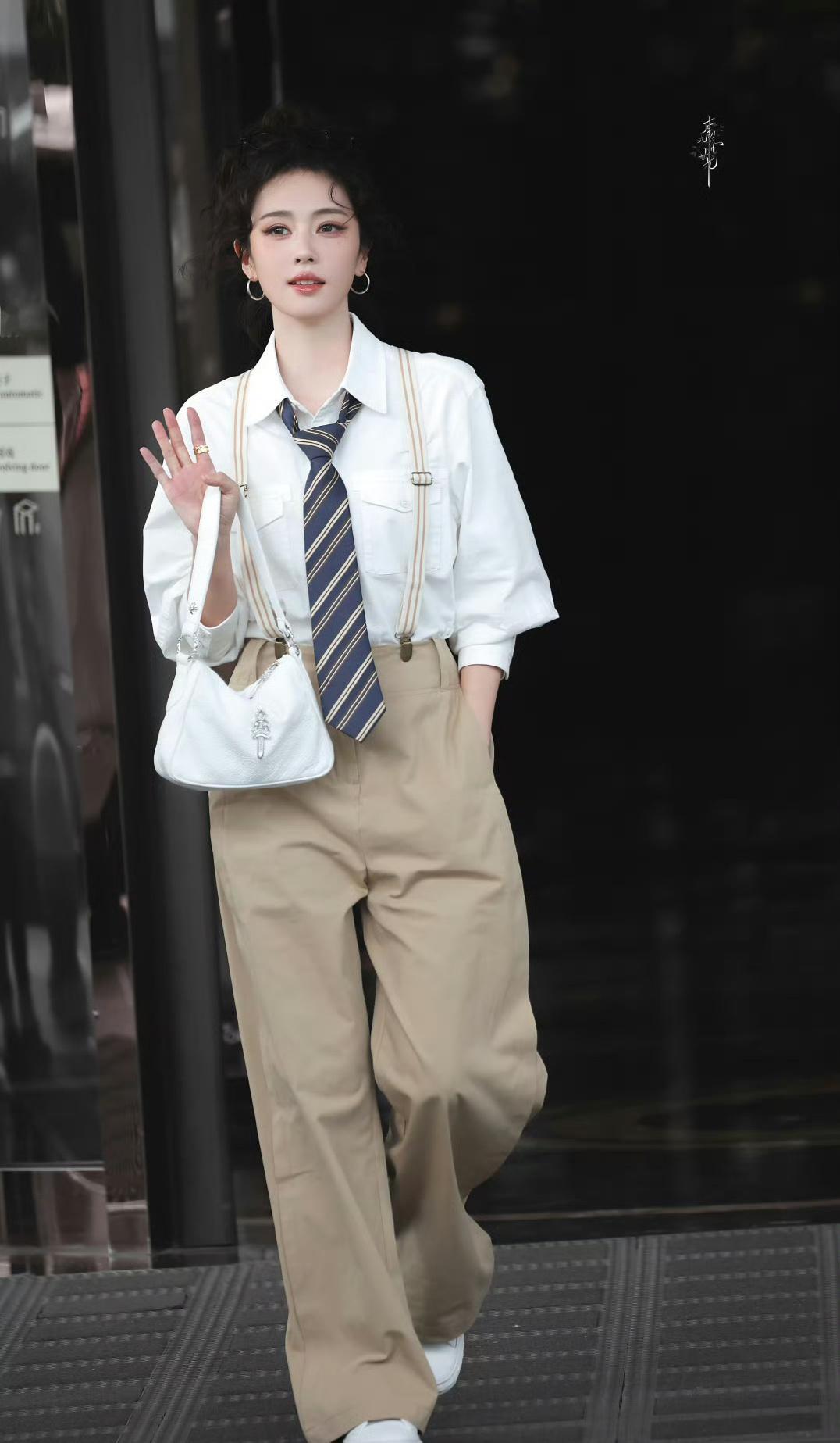 今天背带裤版白鹿好有少年感哇白鹿白衬衫背带裤造型白鹿卷发背带裤造型