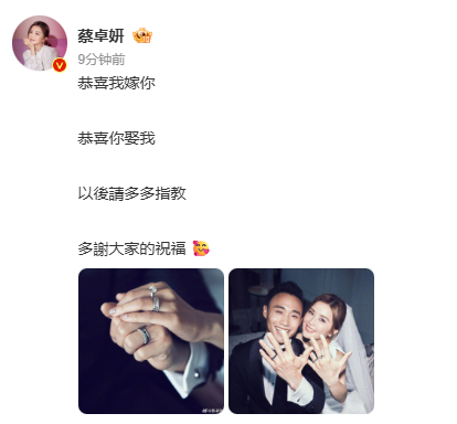 【蔡卓妍宣布结婚】???一脸震惊!!!恭喜阿Sa~发博:恭喜我嫁你,恭喜你娶我,以后请多多指教,多谢大家的祝福。蔡卓妍结婚 去年11月,阿Sa被曝与小10岁的健身教练Elvis林俊贤交往中,阿Sa今年1月在采访承认恋情,3月承认已带男方见家长。恭喜!