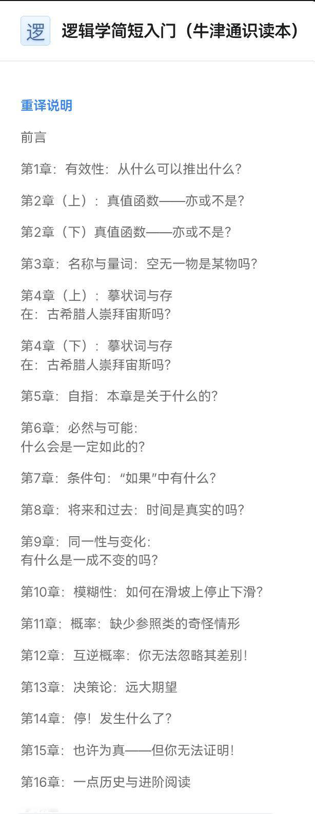 电子书《逻辑学简短入门》牛津通识读本的重译版。地址:wxflogic.gitbook.io/logicGraham Priest 的 Logic: A Very Short Introduction 是牛津通识系列中的一本。该书在众多逻辑学入门书中独树一帜,并不试图完整介绍逻辑学的理论,而是通过一些哲学难题或逻辑谜题引入解决这些问题的逻辑理论和方法,在介绍逻辑知识的同时展示逻辑可以如何来用。译者wxflogic发现之前的翻译有些术语不太准确,所以重新翻译了一下。AI创造营