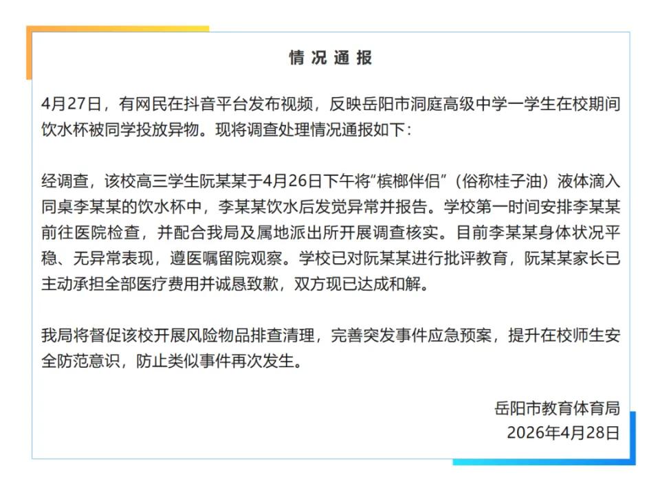官方通报学生水杯被同学投异物 4月27日,一段视频在抖音热传:湖南岳阳洞庭高级中学一名高三男生,喝水后突然剧烈抽搐、呼吸急促,被紧急送医,确诊为呼吸性碱中毒,咽喉和呼吸道黏膜受强烈刺激损伤。 谁干的?他的同学阮某某。干了什么?往水杯里滴了“槟榔伴侣”——也就是俗称的桂子油。那不是普通调味剂,而是高浓度肉桂精油,强刺激性物质,学校早已明令禁止携带入校。阮某某明知故犯。 官方4月28日发了通报:学生身体状况平稳,批评教育,双方和解。措辞轻飘飘得像在处理一次课间打闹。 我只想问一个最简单的问题:换成你,别人往你水杯里加你不知道的东西,你喝下去之后浑身抽搐、手脚发麻、意识模糊——你会说这只是个玩笑吗? 这事儿换个场景、换个身份,叫什么我想没有人不清楚。 别拿“年纪小不懂事”糊弄人。这不是恶作剧。处理太轻,埋下的才是真正的危险。 官方通报学生水杯被同学投异物