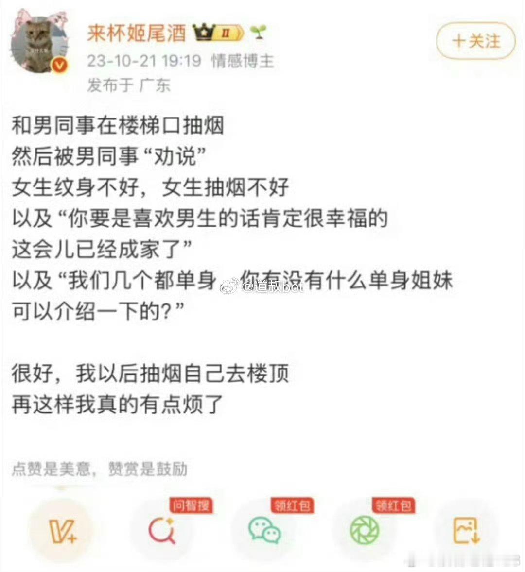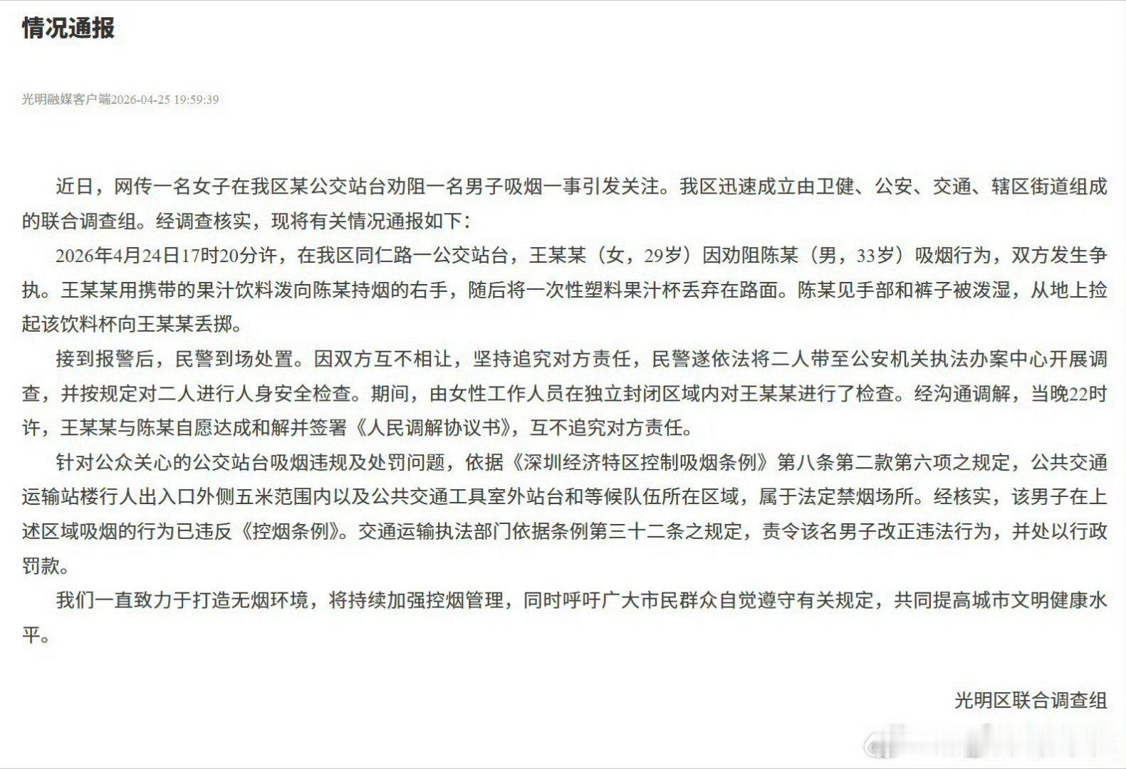 来杯姬尾酒禁烟事件“禁烟议题”果然百试不爽,包打百拳。上次给鲁迅先生禁烟,这次给普通人禁烟。我劝你掐灭烟头,你不听劝,然后一杯饮料直奔主题。谁的修养有那么好,被一杯饮料泼在裤子上不火冒三丈?这事就不该调解,该怎么罚怎么罚。
