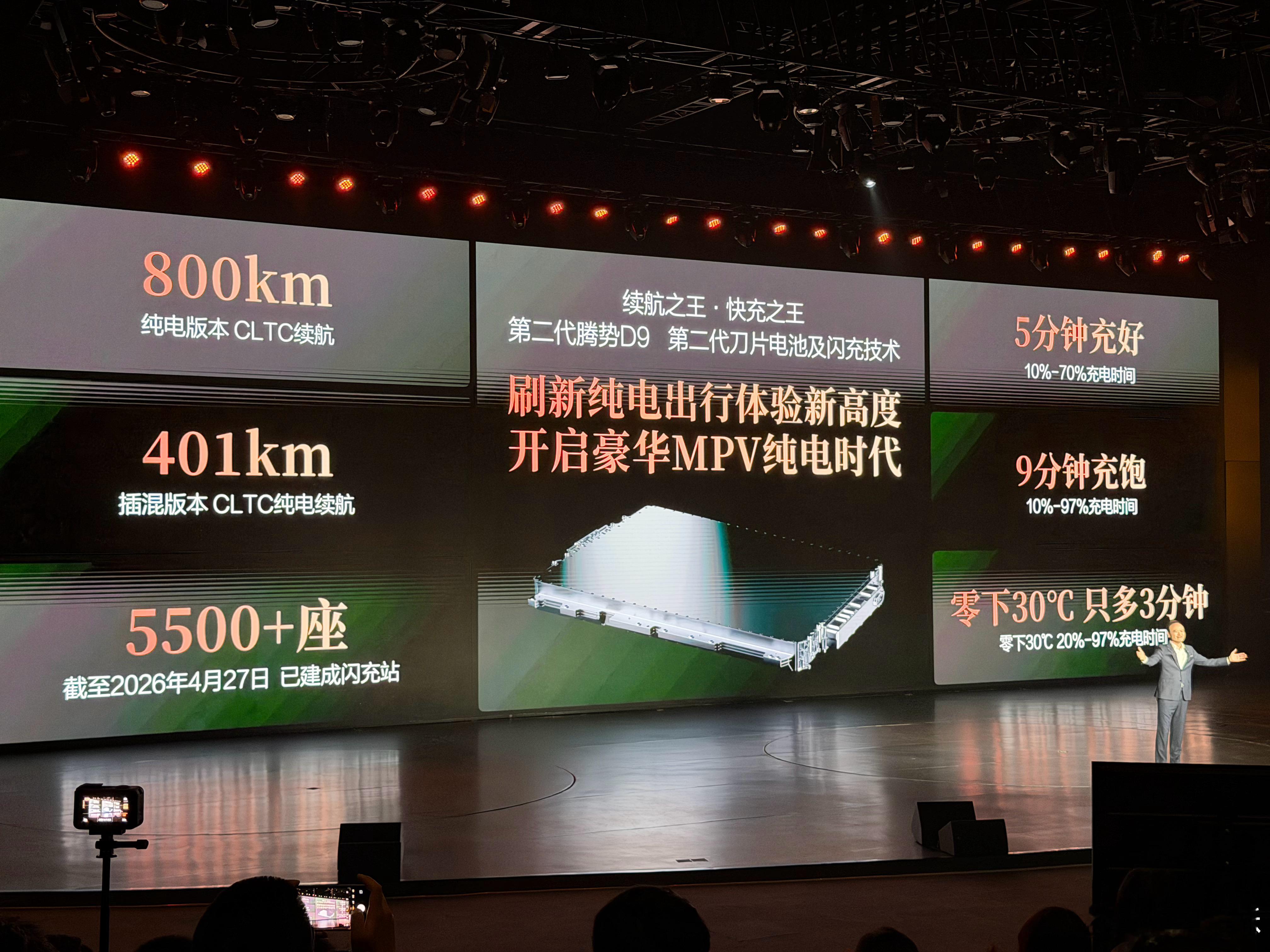 电池续航方面,采用全新的第二代刀片电池+闪充技术。纯电版800km,插混版401km。5分钟充好,9分钟充饱,零下二十度只多3分钟。如果说前面讲的内饰设计、舒适性等方面,友商还能堆料追赶一下;那这一套刀片电池和闪充技术,可以说是真正的领先不止一代,拍马也赶不上了。据我所知,近期几款竞品车型,插混续航普遍只有300km出头,本来看着还好,毕竟车大。但跟腾势D9一比,遥遥落后了属于是,。新能源这一块,迪子深耕数十年不是开玩笑的。
