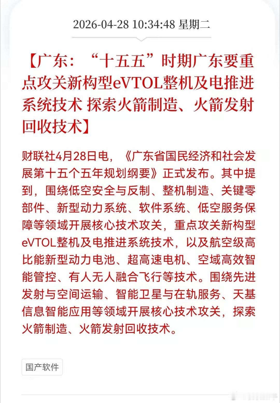 重大利好消息!低空经济与商业航天方向传来利好!广东“十五五”规划释放信号:低空与航天赛道迎来省级战略级推力4月28日,《广东省国民经济和社会发展第十五个五年规划纲要》正式发布,这份文件里的两处部署,正在为中国未来十年的两大高成长赛道注入明确的省级战略动能。规划明确将低空经济与商业航天纳入核心技术攻关清单:一方面,重点攻坚新构型eVTOL整机及电推进系统,同步突破航空级高比能电池、超高速电机、空域智能管控等关键环节,直指低空飞行商业化落地的核心痛点;另一方面,将火箭制造、发射回收技术纳入探索范围,为商业航天产业的全链条布局埋下伏笔。不同于此前零散的政策鼓励,此次规划直接将技术攻关的方向细化到了整机、电推、回收等核心环节,相当于为广东相关产业划定了清晰的发展路线图。对市场而言,这意味着从零部件配套到整机制造,从空域管理到商业化运营,广东本地产业链上的企业,将迎来政策、资金、场景三重加持的黄金发展期。广东作为制造业强省,拥有完整的高端装备制造、电子信息、新能源配套产业链,此次战略加码,能快速将产业基础转化为技术突破的优势。未来,从珠三角的低空通勤网络,到大湾区的商业航天发射场,这些此前停留在概念里的场景,或将在政策推动下率先落地。这份规划释放的信号十分明确:低空经济与商业航天不再是“炒概念”的赛道,而是被省级规划锚定的实体产业方向,相关产业链的价值重估,才刚刚开始。