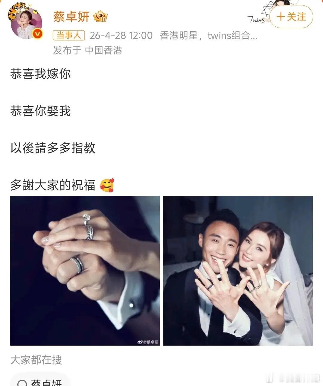 2026年4月28日,43岁的香港艺人蔡卓妍(阿Sa)在微博官宣与33岁健身教练林俊贤(Elvis)结婚,并晒出钻戒婚纱照,配文"恭喜我嫁你,恭喜你娶我,以后请多多指教"引发全网祝福。