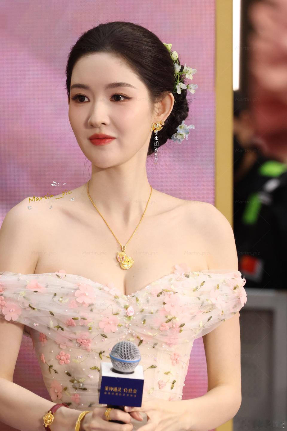 一字肩碎花裙+温婉盘发,王玉雯有颜有料