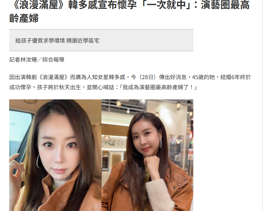 据联合报,韩国女星韩多感(旧名韩恩贞)28日发布亲笔信,宣布在结婚第 6 年后,终于迎来了珍贵的新生命。现年45岁(韩国算法47岁)的她,坦言自己可能是“韩国女演员中的最高龄产妇”,字里行间充满了初为人母的喜悦。恭喜!!