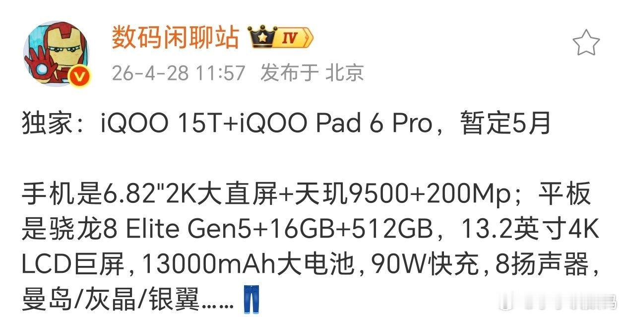 iQOO Pad 6 Pro定位旗舰,搭载骁龙8 Elite Gen5,又是4K高刷LCD屏,又是13000mAh大容量电池。当然即便给了90W有线快充,这也得充好久。而iQOO 15T保留了2K高刷屏,又增配了2亿像素,搭载天玑9500定价会是多少呢?