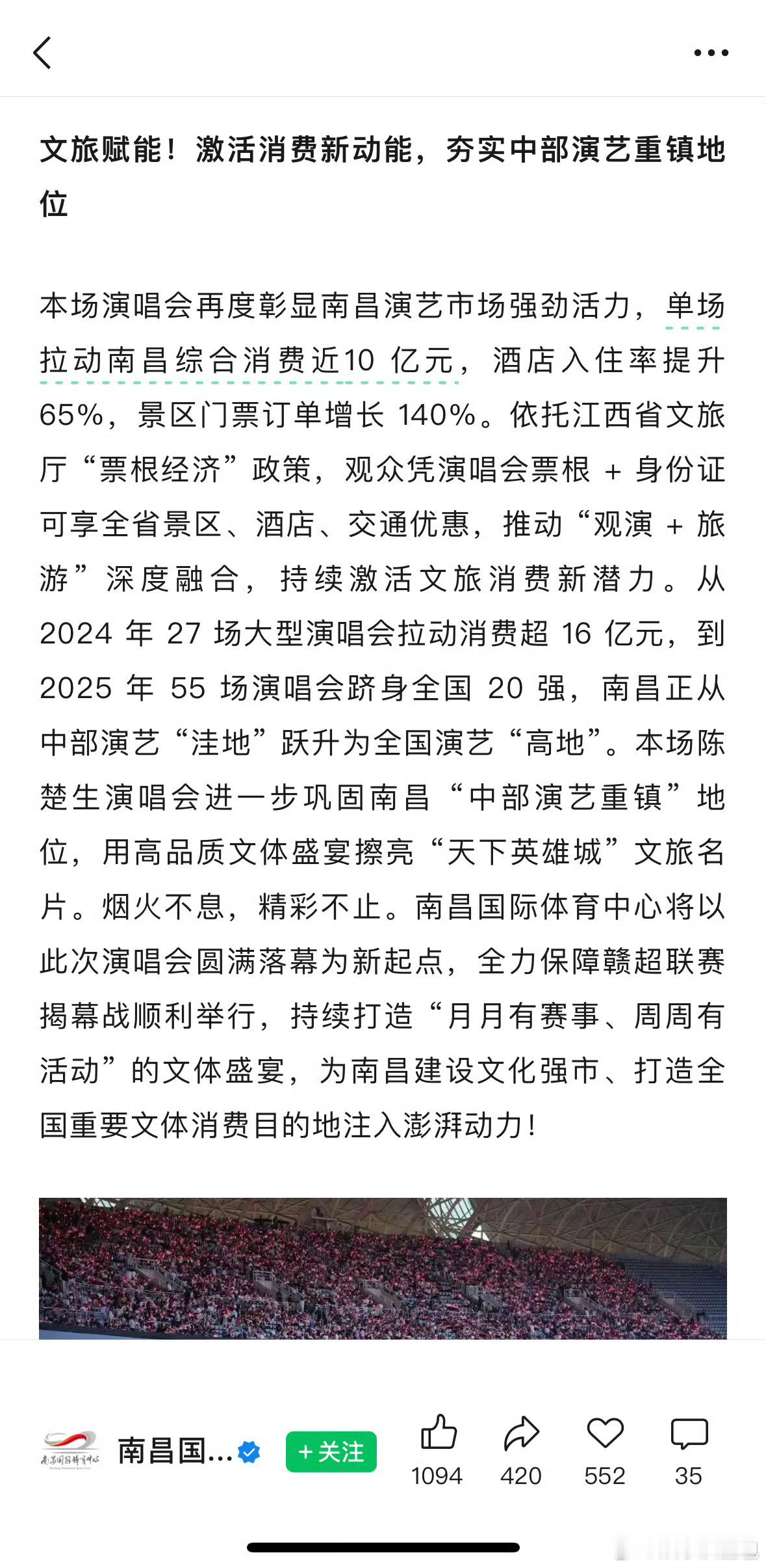 陈楚生演唱会拉动南昌消费近10亿元陈楚生演唱会首创环保花车巡游 一场演唱会激活一座城的活力!近10亿消费让南昌的街巷都透着热闹,环保花车巡游又给这份活力加了层绿色滤镜。陈楚生用歌声连接大家,更用行动传递善意,这样的演唱会,谁不爱呢?