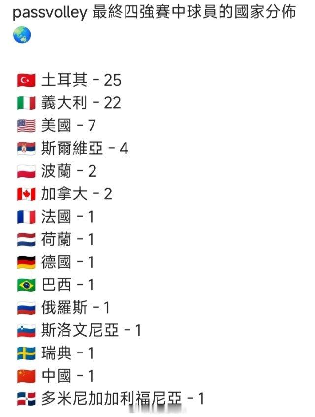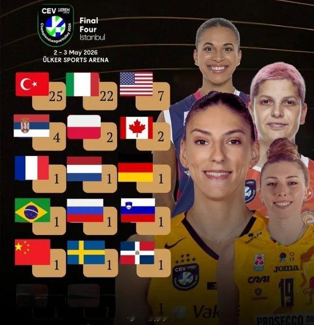 女排女排欧冠 四强之战球员国籍分布:🇹🇷25🇮🇹22