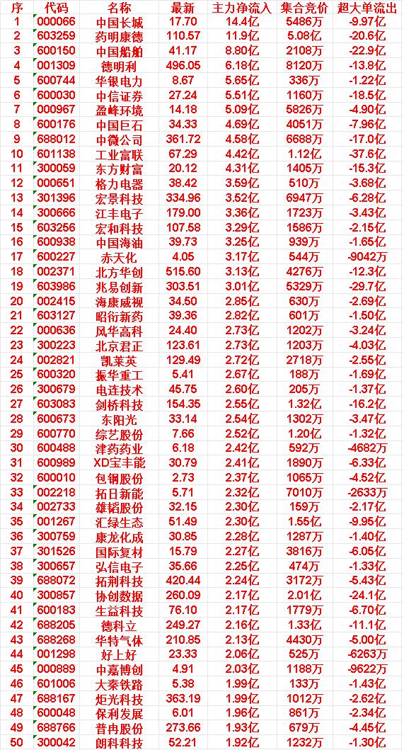 4月28日尾盘30分钟,主力资金“大幅抢筹的”50名单一览! 中国长城:主力资金净流入14.4亿元,但超大单资金净流出9.97亿元。 药明康德:主力资金净流入11.9亿元,超大单资金大幅净流出20.6亿元。 中国船舶:主力资金净流入8.80亿元,超大单资金净流出22.9亿元。 德明利:主力资金净流入6.18亿元,超大单资金净流出13.8亿元。 华银电力:主力资金净流入5.65亿元,超大单资金小幅净流出1.22亿元。