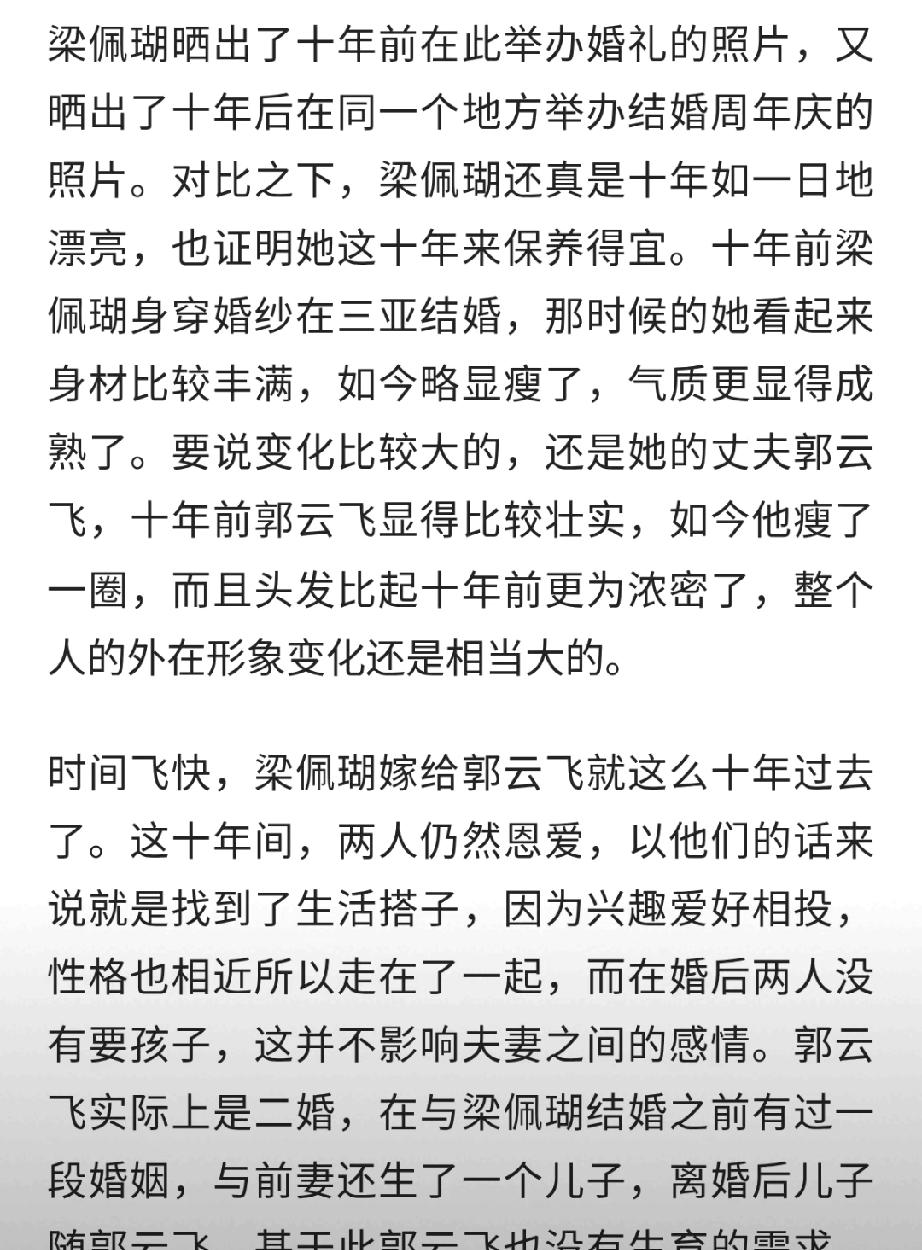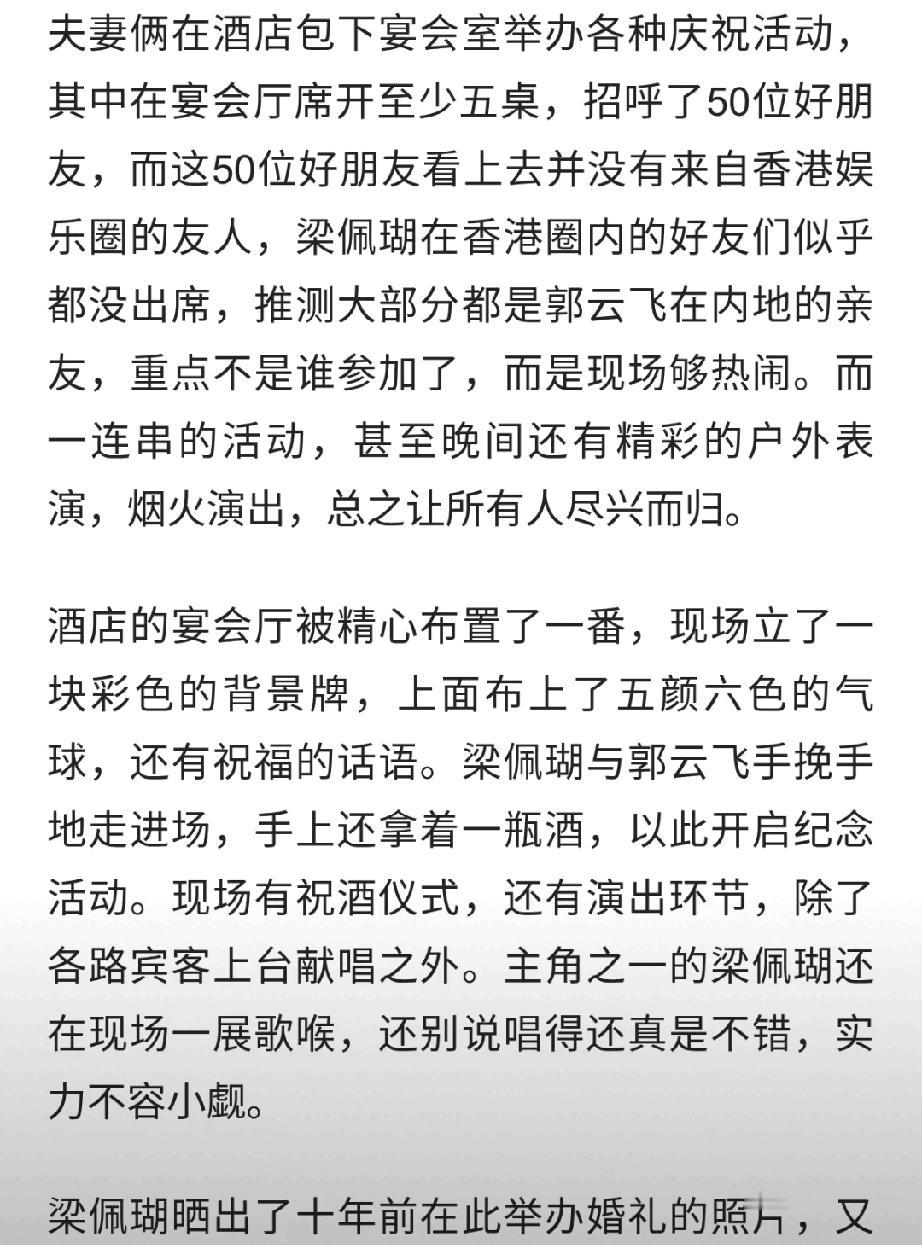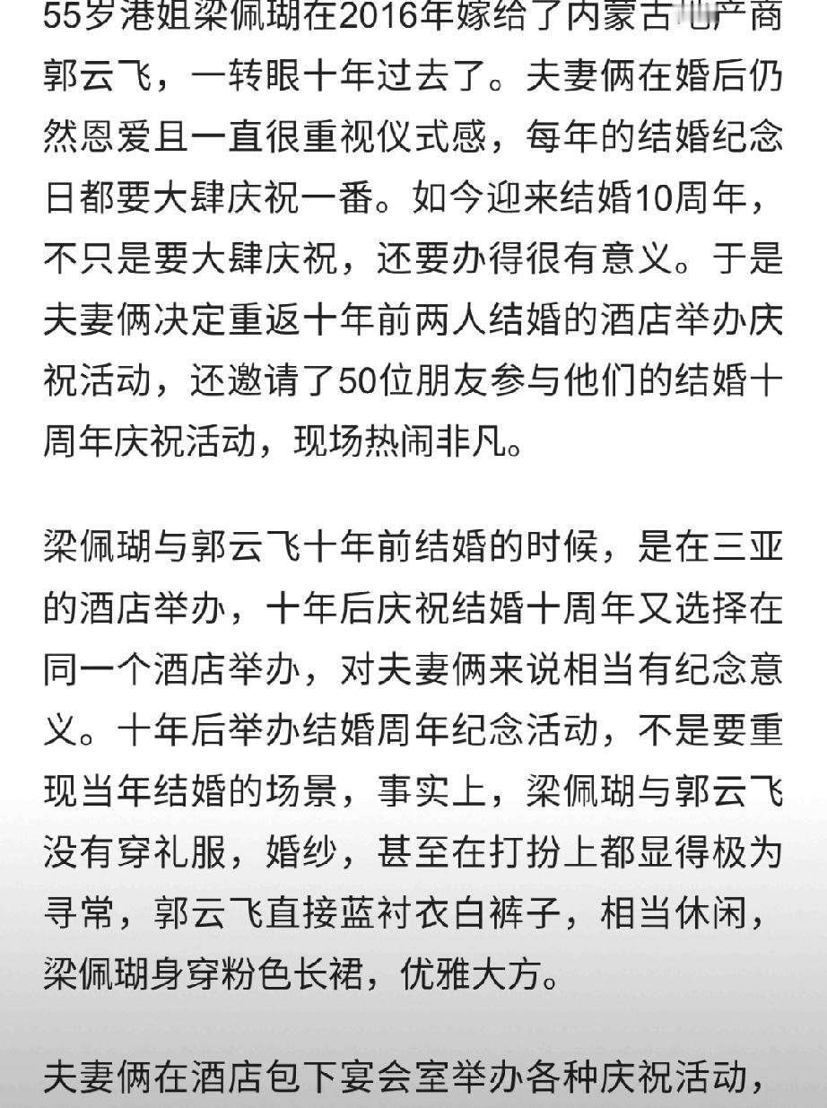55岁港姐梁佩瑚庆结婚10周年!回三亚婚礼原址设宴,50人到场超热闹 55岁前港姐梁佩瑚,2016年嫁给内蒙古富商郭云飞,如今迎来结婚十周年。夫妻俩特意重返当年三亚结婚的酒店,举办纪念派对,还邀请了约50位亲友到场,现场布置温馨、气氛热烈。 梁佩瑚曾是1989年港姐季军,情路几经波折,嫁入豪门后低调幸福,保养得宜状态极佳。十年婚姻依旧甜蜜如初,重回故地补办纪念宴,仪式感拉满,不少网友纷纷送上祝福,羡慕这对跨越千里的恩爱夫妻。 梁赛瑚 林薇婚戒