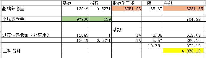 网上刷到的,来列一下公式。 所有信息见图一,下面都是根据图一的推测和计算。 基本情况:男性,60岁退休,累计缴费35年5个月,其中视同缴费年限5年1个月,实际缴费30年7个月,个人账户9.79万,Z实指数0.5271。 基础养老金3281.65元,个人账户养老金704.32元,过渡性养老金612.09+360.10=972.19元,总计4958.16元。 估计总数的角分会有和核定表有点误差,这是因为不知道个人账户9.79万后面具体的尾数是多少。 具体计算见图二。