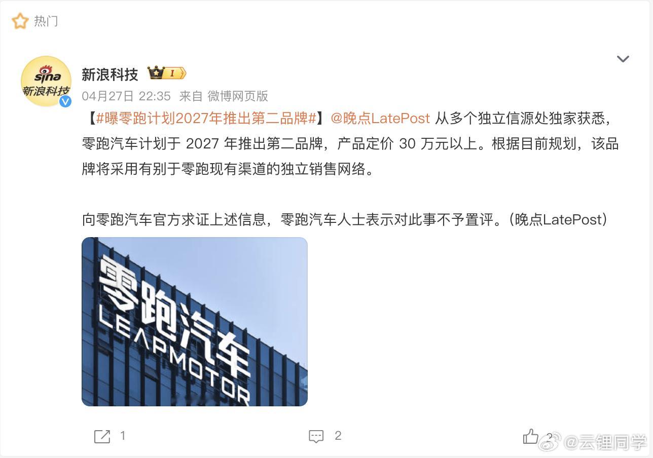 零跑计划2027年推出第二品牌 零跑真的是从小车一点点造到豪华市场的,从不搞二元高低端之论,也没有搞什么火箭喷气+地效底盘给你造高端,已经很良心了。这年头的汽车圈,说你是一家“正常车企”,已经是相当顶级的评价了...