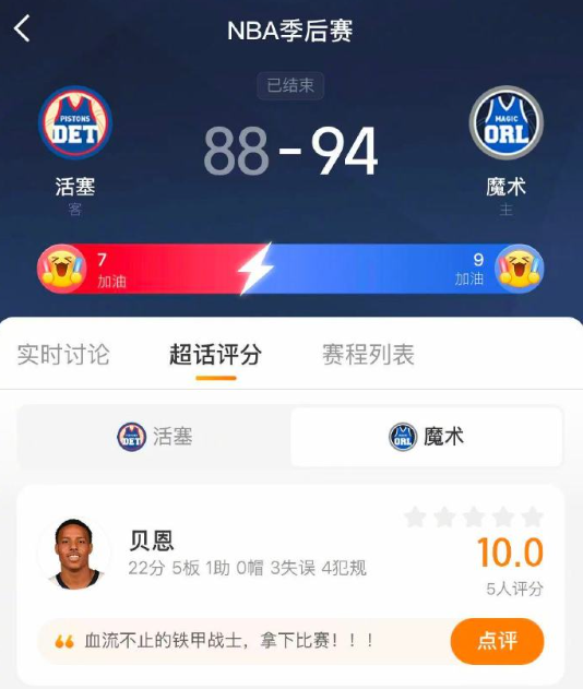 黑八要来了吗?魔术94-88战胜活塞,3-1领先拿到系列赛赛点。贝恩22分,瓦格纳19分,班凯罗18分。活塞方面,坎宁安25分,杜伦12分。