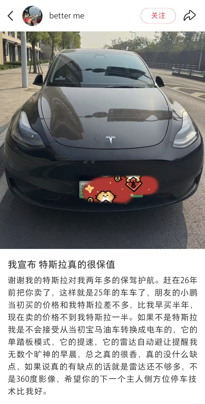 特斯拉车主“better me”表示:身边友人购入的同级其他品牌纯电车,当初购车价格与特斯拉相近,如今二手残值却不足特斯拉的一半。