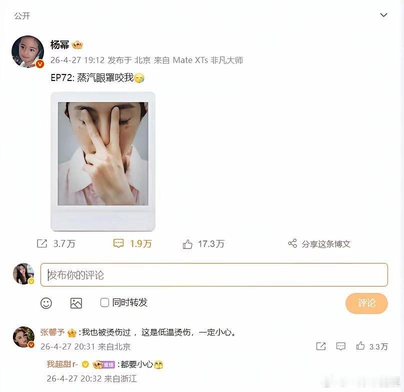 看到杨幂被蒸汽眼罩烫伤我才终于知道为什么张馨予的风评可以一路逆转没有塌房这次杨幂被蒸汽眼罩烫伤张馨予没过多久就评论了贴心提醒杨幂要小心之前和迪丽热巴拍《幸福触手可及》的时候因为迪丽热巴低血糖会给对方准备糖果和温水还会贴心的帮迪丽热巴夹出饭菜里的香菜《奇兵神犬》的时候杨烁恐高、姜潮害怕她都是先行完成动作示范然后又耐心鼓励两个大男人克服心理障碍即便是对李晨这位前男友也从未多说过什么如果娱乐圈颜值是入场券那么人品一定会是常青树更何况她还是国家严选的军嫂大家是从什么时候开始喜欢张馨予的呢?