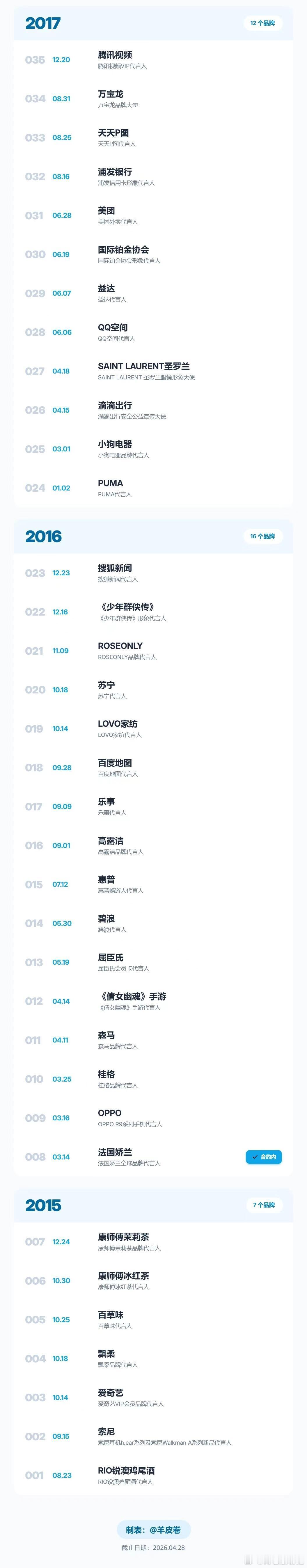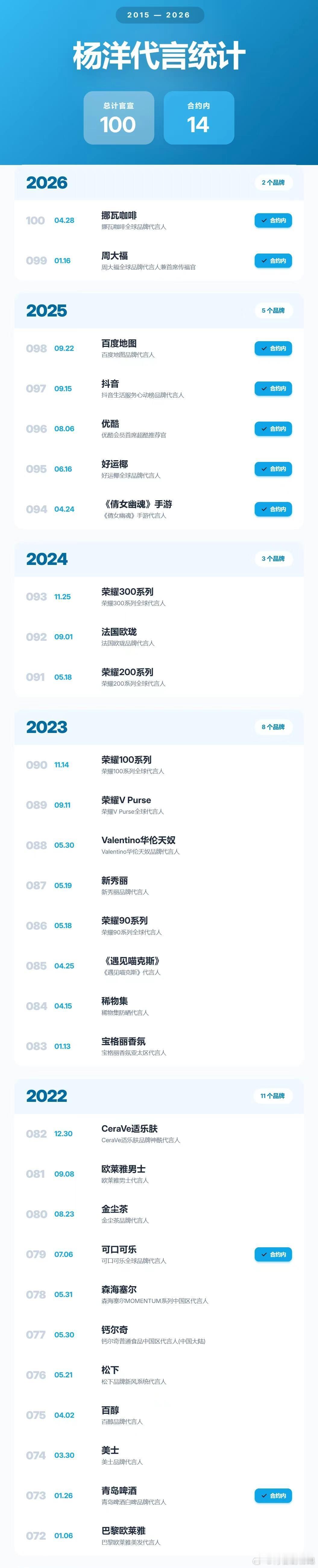 杨洋解锁第100个代言恭喜杨洋解锁第100个代言里程碑!🎉🎉从2015到2026,长红十几年的含金量还在上升,真的太优秀了杨洋解锁第一百个代言