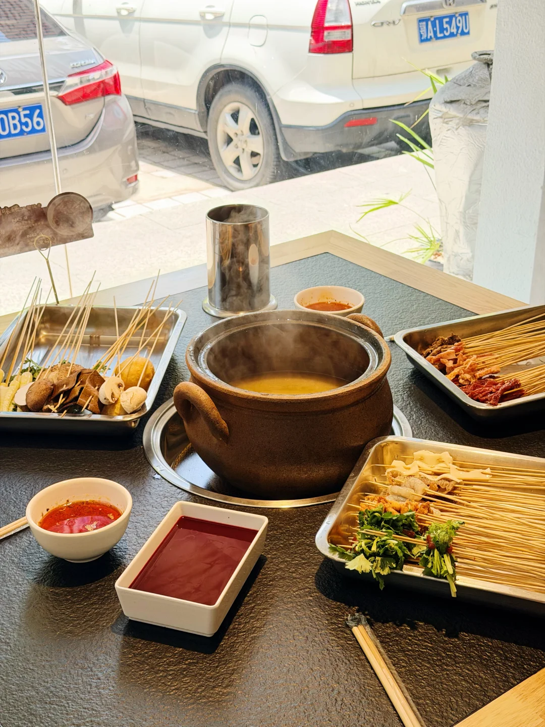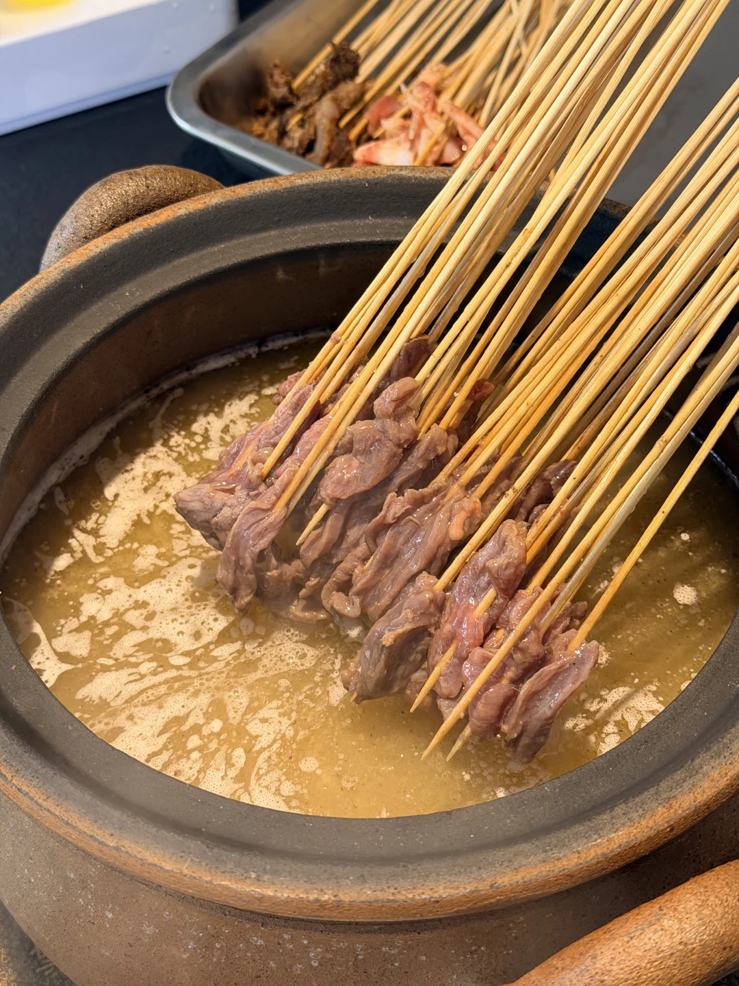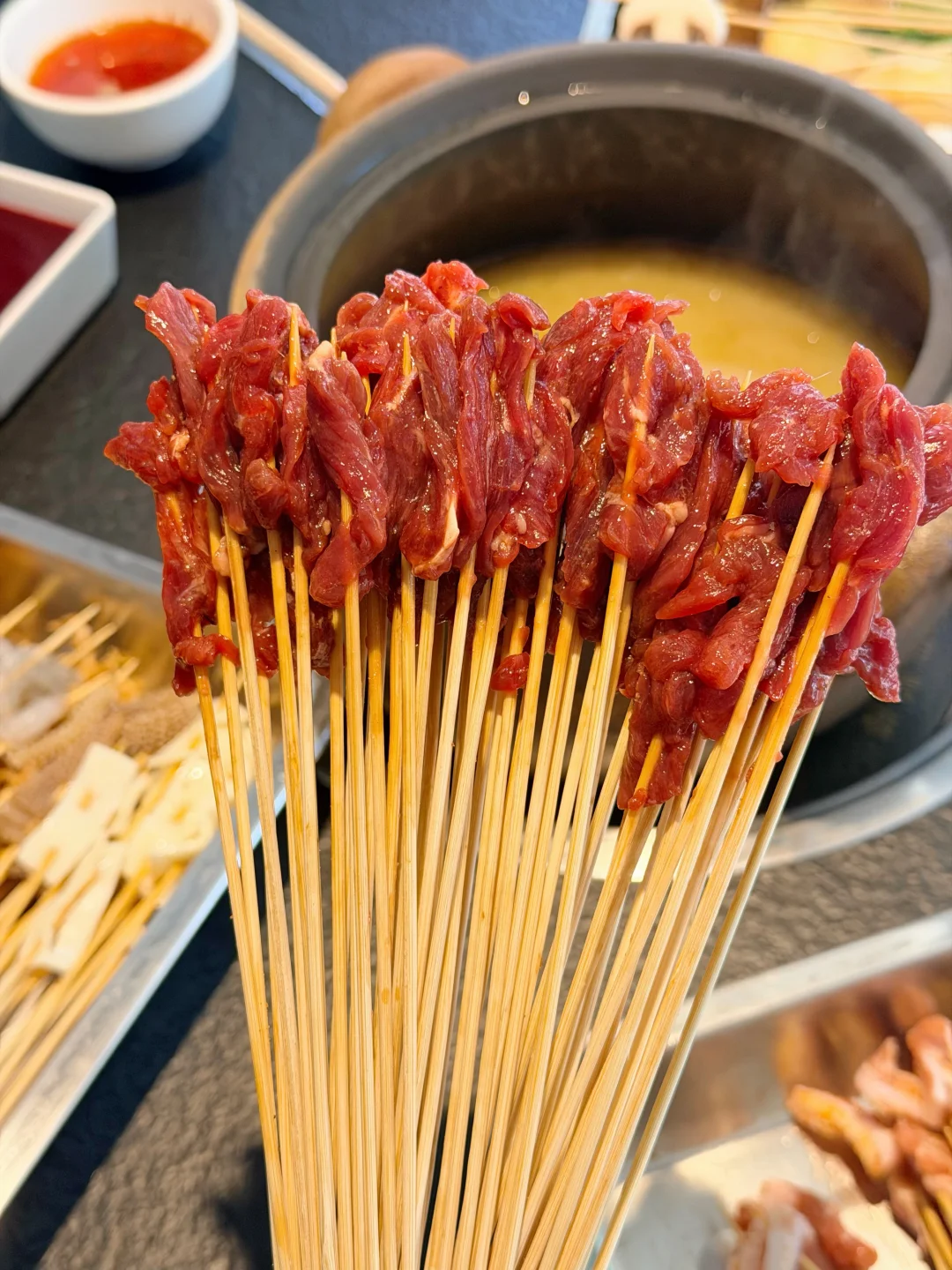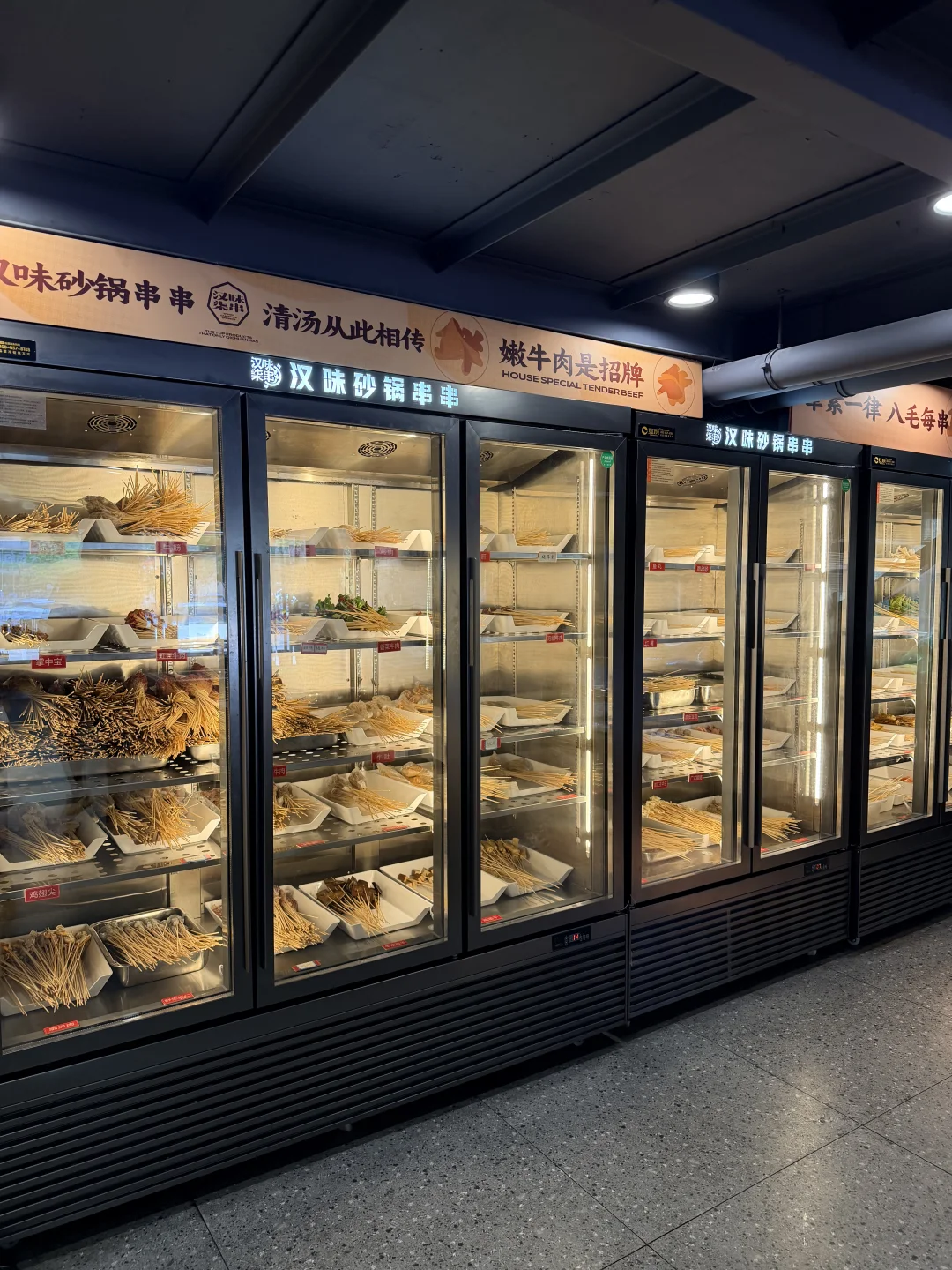 这家砂锅串串在武汉开了好多年了!!现在居然开到家门口了… 就在梅苑小区地铁站这里🚇还可以免费停车 为了不排队,闭眼冲午市✔️ 锅底是牛骨汤底,每天都是现煨的,清汤锅底配上秘制蘸料🙃绝 肉的种类蛮丰富,必点的是他家的招牌牛肉,巨嫩!! 牛筋牛肚香菜牛肉缸豆牛肉虾仁鸭掌筋🍤都是8毛钱一串 都点上也不会觉得肉疼~ 素菜都好新鲜啊,青菜都嫩的滴水🤩豆油皮都是现擀的 人均消费7、80就能吃爽👍