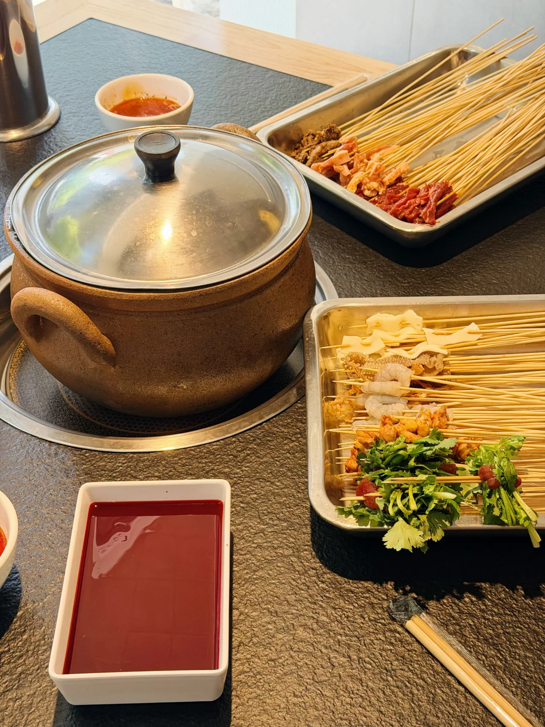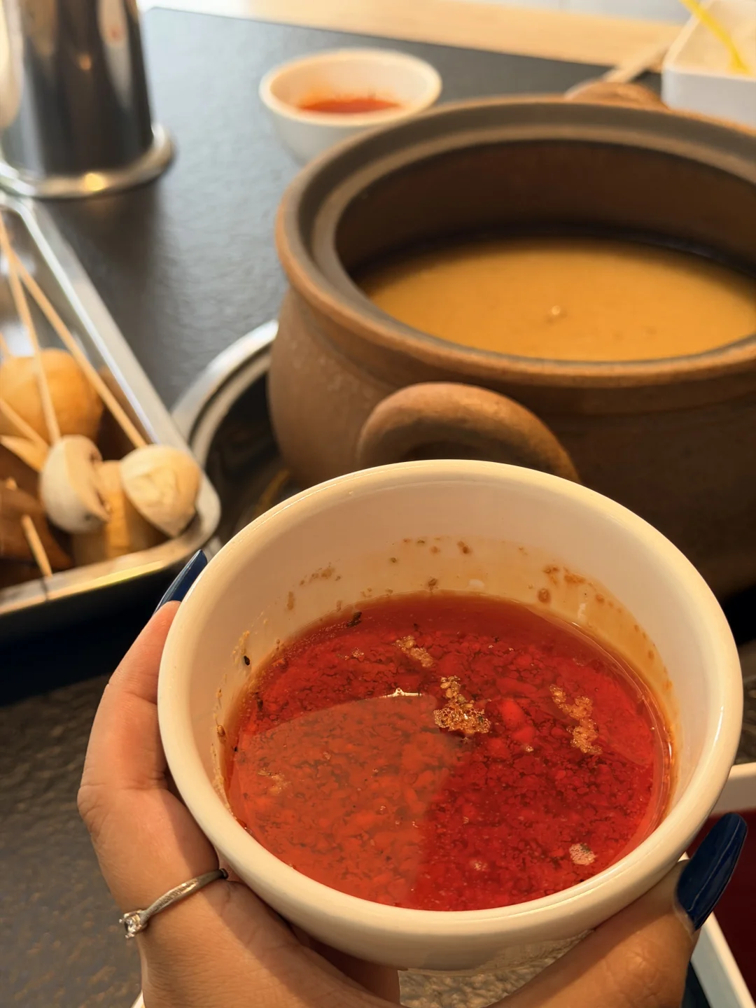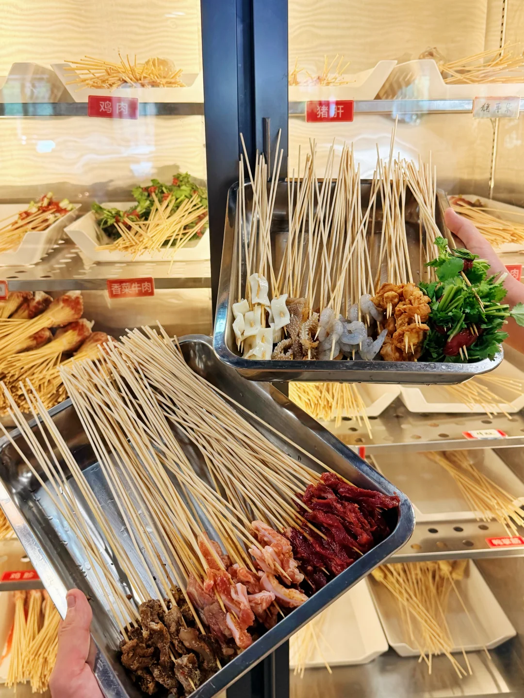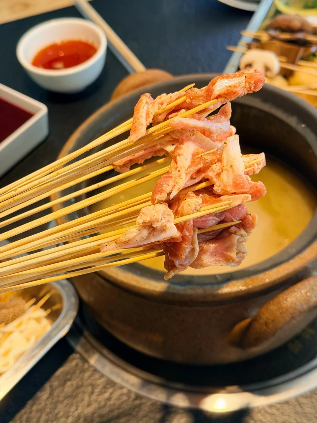 这家砂锅串串在武汉开了好多年了!!现在居然开到家门口了… 就在梅苑小区地铁站这里🚇还可以免费停车 为了不排队,闭眼冲午市✔️ 锅底是牛骨汤底,每天都是现煨的,清汤锅底配上秘制蘸料🙃绝 肉的种类蛮丰富,必点的是他家的招牌牛肉,巨嫩!! 牛筋牛肚香菜牛肉缸豆牛肉虾仁鸭掌筋🍤都是8毛钱一串 都点上也不会觉得肉疼~ 素菜都好新鲜啊,青菜都嫩的滴水🤩豆油皮都是现擀的 人均消费7、80就能吃爽👍
