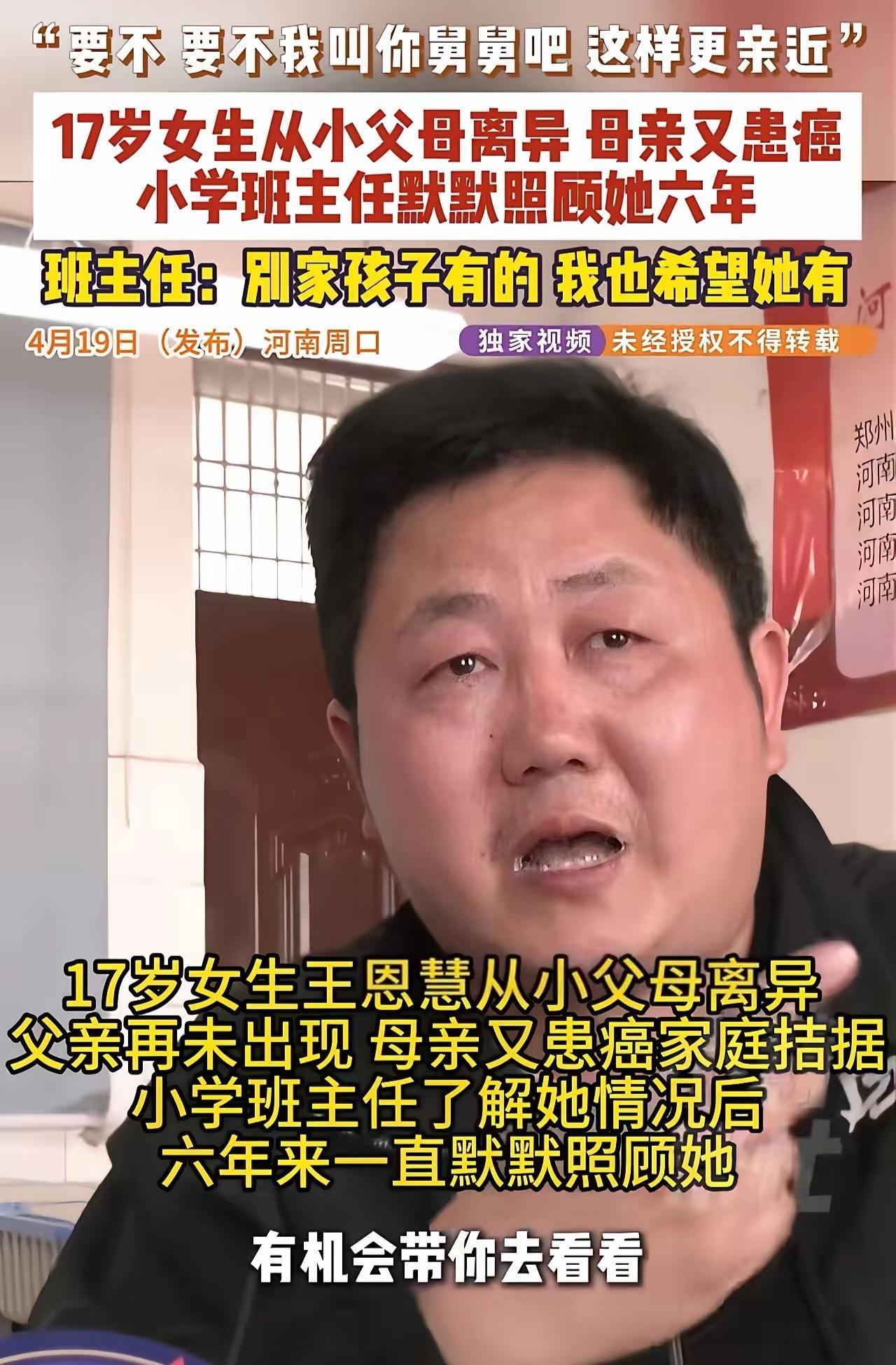 “这个男老师必须让他火!”一声“舅舅”喊了6年,背后真相看哭全网 咱们今天聊个暖心的故事。一个11岁的小女孩,父母离婚早,跟着妈妈挤在十几平的出租屋里。后来妈妈又查出宫颈癌,家里穷得揭不开锅。孩子想辍学去打工,可她的班主任没同意,反而默默撑起了这个家。一撑就是6年。女孩后来管他叫“舅舅”,这声舅舅,叫哭了所有人。 一、女孩想辍学救妈妈,老师用“谎言”护住了她的自尊 王恩惠的童年太苦了。爸妈离婚后,爸爸再没露过面。妈妈打零工,娘俩勉强糊口。2016年,她刚上五年级,妈妈确诊宫颈癌,手术花光所有积蓄,还欠了债。术后妈妈干不了重活,家里没了收入。 11岁的恩惠每天放学熬药、做饭,等妈妈睡了再写作业。她偷偷想过:要不别上学了,去刷盘子挣钱给妈治病。 那天放学下大雨,恩惠和妈妈在校门口抱头痛哭,浑身湿透。班主任魏巍正好看见,一问情况,心里像被狠狠揪了一下。他没多说什么,转头就做了个决定:这孩子的书,我帮她读下去。 但他特别细心。他知道半大的孩子要面子,从来不在班里提这事。每次都是趁没人,把恩惠叫到办公室——生活费夹在课本里,说是“学校发的困难补助”;换季的新衣服新鞋递过去,说是“亲戚家孩子穿不下,扔了可惜”。 妈妈去化疗,魏老师只要有空就提着营养品往医院跑,帮着排队取报告、打扫出租屋。见恩惠妈妈过意不去,他就说:“姐,你就把我当亲弟弟,别跟我见外。” 恩惠心里跟明镜似的:哪有那么多刚好合尺码的“旧衣服”?都是魏老师怕她在同学面前抬不起头。 二、一声“舅舅”喊了6年,这背后藏着哪些法律门道? 初中毕业那天,恩惠攥着高中录取通知书冲进魏老师办公室,憋了半天,红着眼喊了声“舅舅”。魏巍愣了几秒,也红了眼眶。从此,这个没有血缘关系的“舅舅”,每周去看她,送吃的、留生活费。恩惠上了高中住校,他雷打不动半个月去一次,帆布包里永远塞着零食、学习资料,还有偷偷夹在笔记本里的钱。 很多人感动之余会问:这种事,法律上咋看?咱们来掰扯几条。 1. 女孩爸爸不闻不问,违法了吗? 根据《民法典》第26条,父母对未成年子女有抚养、教育和保护的法定义务。父母离婚后,这不代表义务就消失了。王恩惠的爸爸一走多年没音讯,既不给抚养费,也不露面,这已经涉嫌 “遗弃” 。如果情节严重,比如导致孩子生活无着、疾病、危困,还可能触犯《刑法》第261条的遗弃罪,最高能判5年有期徒刑。 实践中,恩惠妈妈可以起诉追索抚养费,甚至申请撤销男方的监护资格。但很多单亲妈妈不懂法,或者找不到人,只能自己咬牙扛着。 2. 11岁想辍学打工,法律允许吗? 绝对不行。我国《劳动法》第15条明确规定:禁止用人单位招用未满16周岁的未成年人。文艺、体育单位经批准招专业学员除外,但刷盘子、进厂这些普通工作,用童工就是违法。老板敢用,轻则罚款,重则吊销执照。而且《义务教育法》也规定,孩子必须接受九年义务教育。恩惠当时五年级,学校和老师有责任劝她复学,魏老师做得对。 3. 魏老师自己掏钱资助,有没有风险? 纯粹个人自愿帮扶,法律上没问题,反而是大善。但要注意,他如果说“学校发的补助”来维护孩子自尊,这属于善意的“谎言”,不构成欺诈,因为没有非法占有目的。真正值得点赞的是,后来有人想捐款,魏老师全婉拒了。他说自己工资够用,不想孩子背上人情债。这个做法很明智——非正规募捐一旦公开,可能涉及《慈善法》的监管问题(个人不能公开募捐,只能求助或找正规机构)。魏老师守住边界,既保护了孩子,也规避了法律风险。 三、最大的善良,是帮人还顾着别人的体面 6年,魏老师从没声张过。他最大的愿望,就是恩惠能考上好大学,找份稳当工作,把自己和妈妈照顾好。恩惠哭着说:“以后我要是有出息了,我肯定不会忘了魏老师!” 说句实在话,行善最难的不是出钱出力,是像魏巍这样——帮人,还小心翼翼地护着人家的尊严。不图名不图利,就想让孩子好好长大。感恩也最难得的不是嘴上的谢谢,是把这份情记一辈子,将来有能力了再传下去。 这才是真正的师者:不止教知识,更是用行动告诉孩子,什么是善良,什么是担当,什么是人间最值得的温暖。 结论:这事儿你怎么看? 一个老师,用自己的工资养了“外甥女”6年。有人问:学校没有贫困补助吗?当地民政没有低保吗?确实,我们的社会救助体系还有盲区,很多边缘家庭够不上政策门槛,或者妈妈不懂怎么申请。 现在问题来了: 1. 如果你是恩惠的妈妈,你会怎么追讨前夫的抚养费? 2. 遇到身边的孩子想辍学,除了像魏老师这样自掏腰包,你觉得学校和社会还应该做什么? 3. 有人说“好人就该被表彰”,但魏老师一直低调,你支持媒体把他的事曝光吗? 评论区聊聊。让这个男老师,真的“火”一把。不是为了流量,是为了让更多人相信:这世上,真有比烛火更暖的光。