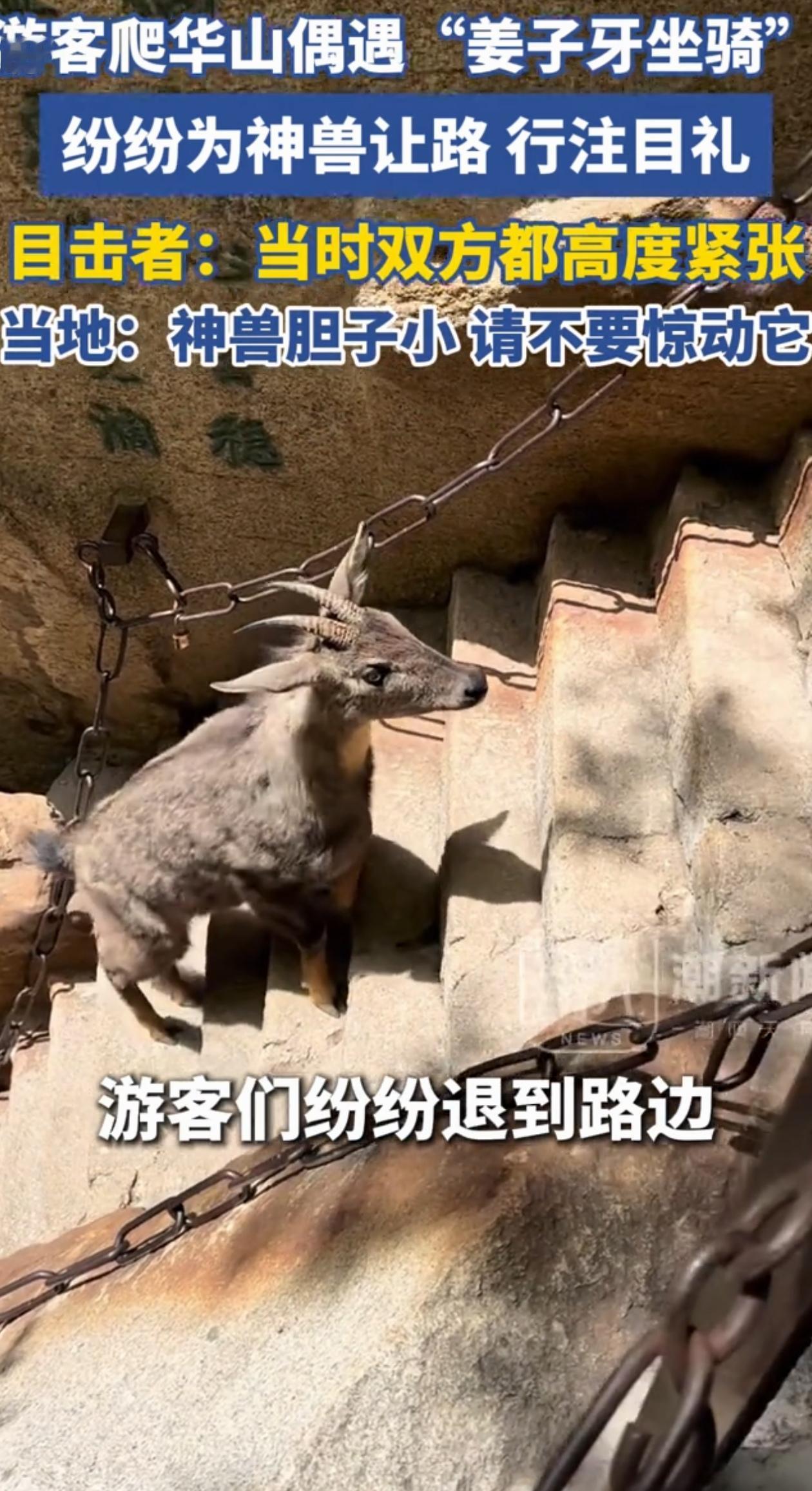 运气真好!陕西渭南,一群游客在爬华山的时候,迎面在石梯上撞见了一只长得很奇怪的动物,它长着驴耳朵、山羊角、小牛身,毛色灰褐,正站在石阶上,有点懵。 游客们也懵了,不知道这是啥,也害怕它顶人,双方大眼瞪小眼,谁都不敢动,空气凝固了好几分钟。 最后,不知道谁带的头,游客们默默往两侧石壁贴紧,让出了一条窄道。那动物这才壮起胆子,蹄子稳稳抓着湿滑的石阶,“哒哒哒”地,从人群中间小跑着过去了。 后来景区证实,这位“登山客”是国家二级保护动物,中华鬣羚,俗称“四不像”,还被看作神话里“天马”的原型。 景区同时提醒游客:这家伙胆子比老鼠还小,遇见了千万别惊扰,让它自己走就行。 有网友觉得游客们最后那波“安静让行”,特别值得点赞。没人起哄,没人扔吃的,更没人拿棍子赶。大家就默默贴着山壁,用注目礼把它送走了。 这种没人说的默契,反而体现了对野生动物的尊重。 人愿意让路,未必是怕了,更多的是明白了这山道人家也有份。 毕竟买了门票进了景区,不代表这地儿就只归人类用了。人家“四不像”祖祖辈辈就在这山头过日子,那些险峻的石阶,在它眼里就是回家的寻常小路。 它的出现,像在提醒我们:人类规划出来的游览区,不过是盖在了动物们的“老宅基地”上。咱是客,人家才是常驻户。 真正的“牛”,不是去哪儿征服了什么,而是在哪怕最惊险的路上,也能给其他生命让个道,心里存一份对自然的客气。 古人把它说成“天马”,所以好像遇见了就代表运气挺好,但现在我们知道它是国家二级保护动物,能在险峻的华山见到它,不是什么玄乎的“祥瑞”,而是生态环境变好,动物数量变多,胆子也变大了的实在证据!这都离不开平日里对动物和自然的保护!
