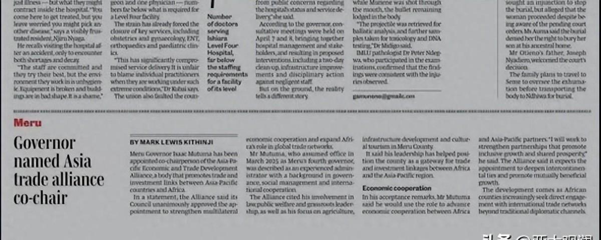 谁能想到,远在万里之外的东非大陆,一位地方官员的人事任命,竟会在咱们亚太经贸圈砸出不小的水花。 近日,东非影响力首屈一指的英文大报——肯尼亚《国家报》罕见地腾出重要版面,发表了一篇长篇评论。 这背后释放的跨国战略信号,绝非表面上看起来那么简单,简直是一步四两拨千斤的妙棋。 被推上风口浪尖的主角,是肯尼亚梅鲁郡的现任郡长,艾萨克·穆图马。 就在最近,这位老兄正式接过了“亚太经贸发展联盟”联席主席的帅印,直接跨进了一个重量级的国际经贸局。 要知道,穆图马在2025年3月才刚刚坐上梅鲁郡第四任郡长的位子。 但他绝不是个普通的基层官僚,而是一位在社会治理和国际合作领域摸爬滚打多年、深谙行政管理之道的硬核老手。 说句掏心窝子的话,过去这么多年,非洲兄弟在国际贸易的牌桌上吃尽了闷亏。 西方国家主导的那套传统外交框架,不仅效率慢得让人抓狂,附加的政治条件更是多如牛毛。 面对这种被处处掣肘的困境,非洲大陆急需一条能绕过西方傲慢壁垒、直接对接全球顶级资源的高速通道。 就在这个节骨眼上,亚太经贸发展联盟这艘满载机遇的巨轮,稳稳地抛出了橄榄枝。 穆图马这次毅然接任联席主席,摆明了就是非洲大陆不再坐以待毙,而是主动出击向东方看齐。 他明确表态,要利用自己手里的这把金钥匙,彻底打通非洲与亚太伙伴之间的经济任督二脉。 “强化伙伴关系,一起搞包容性增长,大家共同富裕”,这就是他给出的破局承诺。 咱们必须得盘一盘,这个“亚太经贸发展联盟”到底是个什么神仙段位。 这可不是那种挂羊头卖狗肉的民间协会,人家是实打实立足亚太、面向全球的区域性经贸合作航母。 你看它的发起人阵容,那是真的响当当:尼泊尔前总理卡纳尔、马来西亚前对华特使陈国伟,再加上《亚太日报》董事长金文胜。 政界元老加上传媒大亨的组合,直接把这个联盟的国际战略价值拉到了满格。 它不搞虚头巴脑的那一套,而是通过媒体赋能、产业精准对接以及数字化转型,硬生生砸出了一条政企协同的黄金网络。 看看人家的落子布局,国内在广州、武汉、成都这些核心枢纽都布下了重兵。 一来二去,直接构建起了一个涵盖中东、东盟、中国三大核心板块的全球协同大框架。 其中国南区总部,现在已经霸气入驻了被称为“国际会客厅”的广州之窗。 文章直言不讳地指出,穆图马在这个节点上挑起大梁,时机简直是太绝了。 如今的非洲各国,早就看清了某些国家那种“口惠而实不至”的套路。 他们正急切地越过那些冗长低效的传统外交渠道,直接跑来跟咱们亚太的国际贸易网进行硬核对接。 这绝不仅是一个非洲郡长的个人高光时刻,而是整个“全球南方”觉醒的一个缩影。 当东非的大地与亚太的经济引擎深度齿合,那些企图继续垄断全球规则的旧势力,是时候该醒醒了。