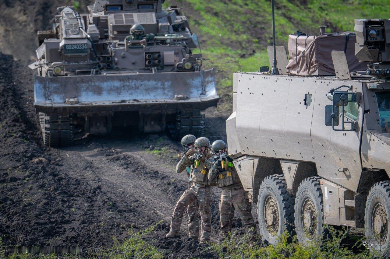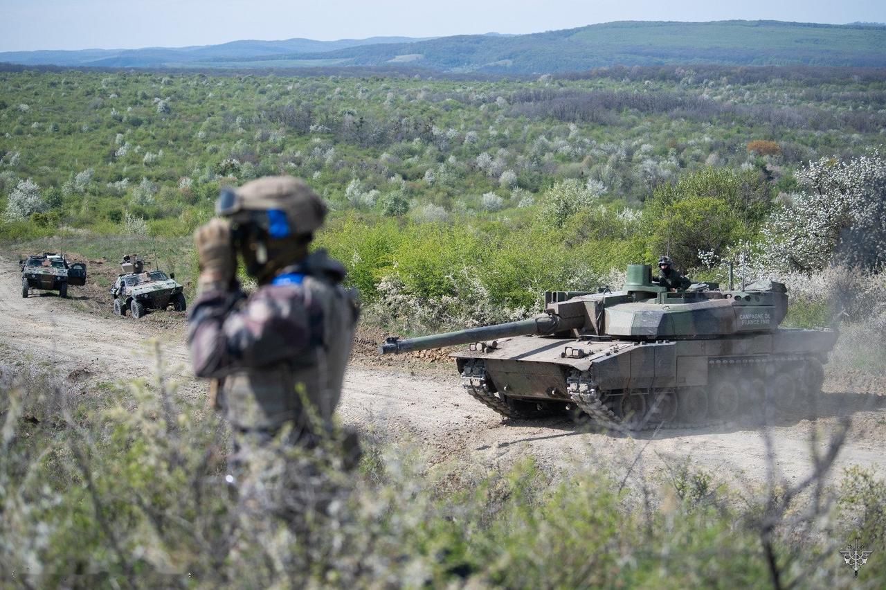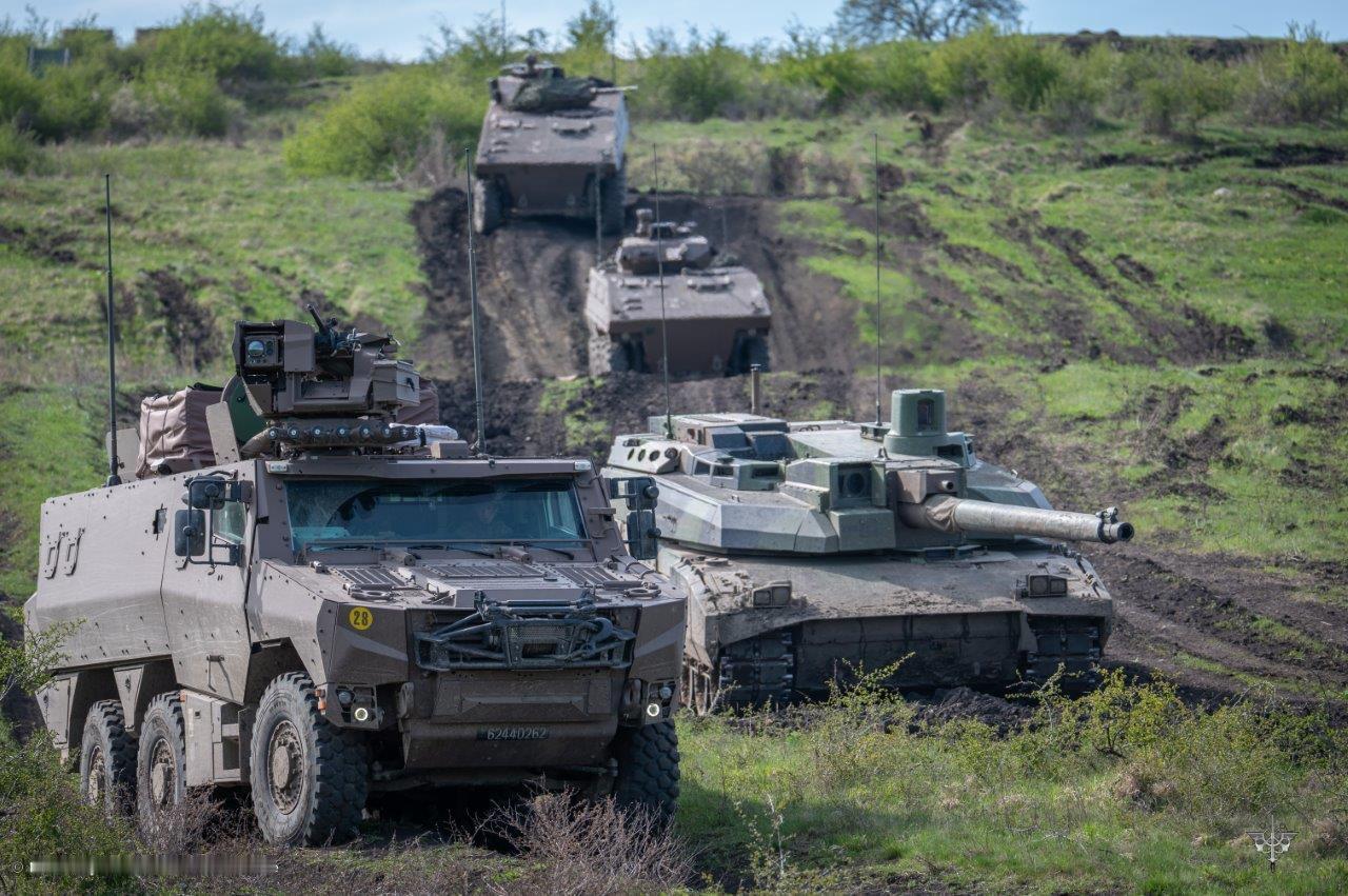 法国陆军演习中展示大规模合成军种的机动能力,主要装甲装备:主战坦克勒克莱尔、VBCI步兵装甲车、装甲工兵车和Griffon多用途防雷反伏击车。