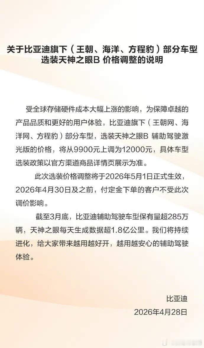 比亚迪部分车型即将涨价面对全球供应链成本持续攀升的压力,比亚迪此次对“天神之眼B”选装包的价格调整,实属理性且克制的市场应对。从5月1日起价格上调2100元,涨幅虽达21%,但比亚迪始终坚持“整车指导价不动、选装包精准微调”的策略,最大程度减少对主流用户的影响。这背后是比亚迪全产业链优势的体现——自研芯片、电池垂直整合,月销超30万辆的规模效应,让它能以基础款车型持续让利(如海鸥增配降价),同时在高阶智驾上合理传递成本。