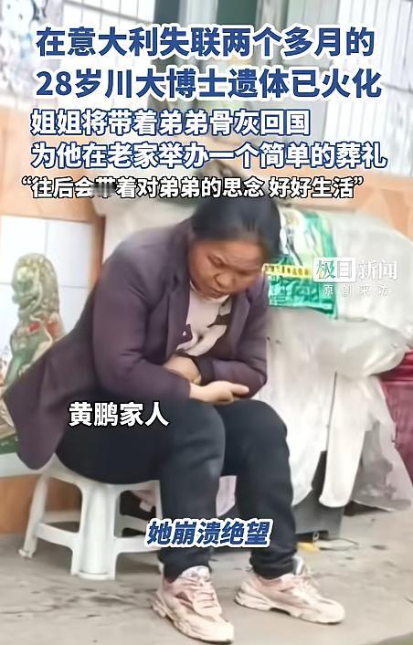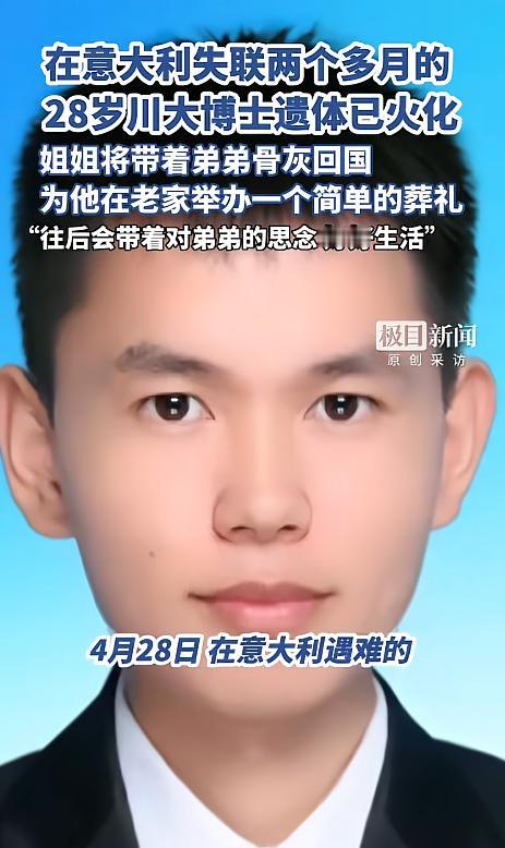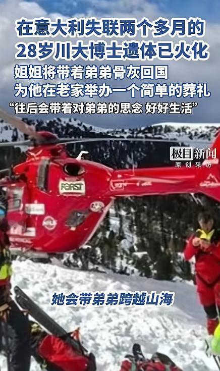 悲痛!川大博士黄鹏意大利考察遇难,遗体已火化,姐姐 4 月 28 日称五一带骨灰回贵州老家安葬。1 月失联两月后在多洛米蒂山区被发现,官方排除雪崩致死,疑因突遇暴雪失温,专注学术的寒门学子让人痛心。 - 关于四川大学二十八岁博士生黄鹏的后事有了最新消息,他的姐姐已经亲自赶往意大利当地的殡仪馆办理好了相关的手续,并于近日完成了弟弟遗体的火化工作,她目前正准备带着弟弟的骨灰尽早返回国内, 打算在接下来的五一劳动节期间回到贵州兴义的老家为弟弟办一场简单庄重的葬礼,让这位远在异国他乡的寒门学子能够最终回到故乡入土为安。 黄鹏于一九九七年出生在贵州兴义的一个农村家庭,身为四川大学水利水电学院博士生的他在二零二五年凭借优异的成绩拿到了公派留学的奖学金, 他在意大利图西亚大学学习期间,主要研究方向是技术如何服务可持续发展,以及生物技术在生态水文领域里的实际应用,把这些理论怎么落到现实环境里去做具体分析和实验。为了能给自己的博士论文采集到最真实且关键的野外科研素材,他在二零二六年的一月份独自前往意大利北部的山区进行考察。 其实黄鹏在大学期间就已经积累了比较丰富的户外徒步经验,也不是第一次去条件比较艰苦的野外地区。他之前就多次参与过相关的科研考察,在各种自然环境比较复杂的地方开展过实地工作。他在这次出发去多洛米蒂山区之前也做了非常周全的准备,带齐了所有专业的户外防寒物资和昂贵的科研仪器, 可谁能想到一月十九号那天他在跟姐姐进行了最后一次简短的联系后,就彻底失去了音讯,让远在国内的家人陷入了极度的恐慌。 当地的搜救队和宪兵在接到报警后立刻出动了大量人手,但由于山区那段时间一直被强烈的暴雪天气所笼罩,加上随时可能发生的雪崩隐患导致多次搜救行动都因为安全问题被迫停了下来, 这场跨国搜救整整持续了两个多月的时间,牵动了无数海外华人和国内网友的心,大家都在屏幕前默默地为这个努力的年轻人祈祷,希望奇迹能够发生在他身上让他平安归来。 直到3月30日上午,有几名来自德国和奥地利的游客在登山途中经过富内斯谷一带时,意外在一处发生过雪崩的区域发现了一个被厚厚积雪掩埋的遗体。 当地部门接到消息后迅速赶往现场进行核验,并于当晚正式发布通报确认遇难者就是失联已久的黄鹏,现场发现遗体所穿的衣物和携带的装备与他失踪时完全一致,而且他随身携带的护照也成为了工作人员确认他身份的最关键证据。 意大利当地政府在经过初步调查后发布了官方结论,他们明确排除了黄鹏是死于雪崩冲击的可能性,并根据法医的现场勘查判断他是在遭遇了突如其来的强烈暴风雪后,因为体力严重透支且没有避寒的地方才导致了失温死亡, 遗体被发现时呈现出一种蜷缩的姿态,这也印证了他在极端寒冷的环境中努力想要保暖却最终耗尽了生命,而厚重的积雪也解释了为何之前的搜救没能发现他。 黄鹏的姐姐在得知这悲痛的消息后强忍着心里的泪水,她先是联系了中国驻米兰的总领事馆办理紧急签证,又因为担心老家的爷爷奶奶年纪太大受不了这个打击而选择暂时隐瞒这个噩耗, 一周前她终于跨越重洋到达了弟弟遇难的地方,在处理各种繁琐手续的过程中她看着弟弟生前用过的东西几度哽咽,直到近日终于拿到了弟弟的火化证明,这才带着他的骨灰踏上回家的路。 图西亚大学在黄鹏去世后专门发文表达了深切哀悼,对他在学术上刻苦钻研、专注优秀给予了高度评价。四川大学方面也在持续与各方保持沟通,积极协助家属处理相关后续事宜。 在同学朋友眼里黄鹏生活很简朴一心搞科研出国访学也省经费用来准备野外考察平时零食都不买让人觉得心酸的样子真让人心疼啊。 现在一切的手续都已经在意大利当地办理妥当,姐姐打算尽快带着弟弟的骨灰回到贵州老家,她想在五一劳动节期间为弟弟举办一个体面的葬礼,让这个从农村奋斗出来的孩子能在一片哀思中正式告别这个世界, 黄鹏虽然在追求学术理想的道路上永远地离开了,但他那份不怕吃苦勇于奉献的科研精神将永远留在每一个人的心中,激励着后来者在科学的道路上继续勇敢地前行。 信息来源: 1.极目新闻(2026 年 4 月 28 日):《在意大利遇难 28 岁川大博士遗体已火化,姐姐称会带着弟弟骨灰回国,为他在老家举办一个简单的葬礼》 2.红星新闻(2026 年 3 月 31 日):《中国驻米兰总领事馆通报 "留学生黄某失联案"》