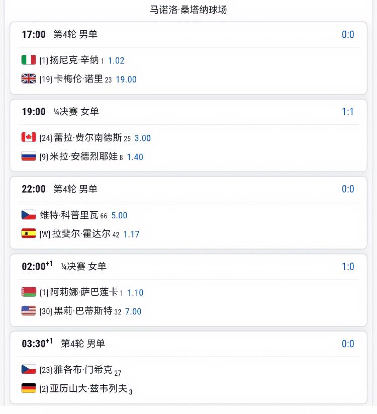 4🈷️28日马德里赛程!! 安排8场男单1/8决赛+2场女单1/4决赛! 每场比赛都很好看!!17:00辛纳对阵诺里,俩人首次交手,赔率1.02:19,妥妥的侮辱性不大伤害性极强。诺里:你们都给我等着!!哈哈、这么多场比赛,你最想看哪一场呢?我想看门希克对阵兹维列夫,只可惜这时间….