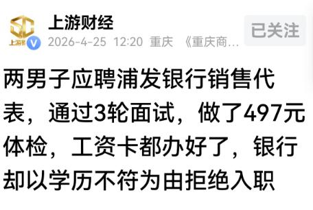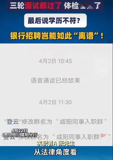 陕西咸阳两名男子应聘银行销售,按要求提交15份资料,闯过3轮面试,每次都确认过学历,还自费497元做体检、办好工资卡,本以为稳拿offer。苦等17天后,银行竟轻飘飘一句“学历不达标”拒录,男子怒怼:不合格早说,别浪费人时间金钱! 陕西咸阳,两名男子最近彻底陷入了两难,花费近一个月时间应聘银行销售,从提交资料到面试、体检、办卡,每一步都按要求完成,本以为能顺利入职,没想到等来的却是一句轻飘飘的拒绝,白白浪费了时间和金钱,连说理的地方都找不到。 两人至今想起这件事,依旧满是无奈和气愤。他们手里还留着体检缴费凭证和工资卡,这些原本是入职的凭证,如今却成了这段糟心经历的见证,497元的体检费不算小数,17天的等待更是耗光了他们所有的期待。 事情的转折发生在等待的第17天,两人迟迟没收到入职通知,主动联系银行询问,得到的答复却让他们当场懵住。银行工作人员简单一句“学历不达标”,就否定了他们所有的付出,没有任何解释,也没有任何补偿。 在此之前,他们早已按银行要求,准备并提交了15份相关资料,每份资料都仔细核对,生怕出现一点差错,毕竟这份工作对他们来说,是难得的机会,也是他们用心争取的目标。 资料审核通过后,两人迎来了一轮又一轮的面试,前后一共3轮,每一轮面试中,面试官都会特意确认他们的学历,确认符合岗位要求后,才会进入下一轮,全程没有任何人提及学历有问题。 面试全部通过后,银行通知他们去指定医院做入职体检,体检费用497元需要自费,两人没有丝毫犹豫,立马按要求完成体检,生怕错过入职机会,体检结果出来后,一切正常,完全符合入职标准。 体检通过后,银行又指引他们去指定银行办理工资卡,说是入职后要用于发放薪资,两人依旧积极配合,跑前跑后办好工资卡,甚至已经开始规划入职后的工作和生活,满心都是期待。 办好所有手续后,银行告知他们回家等待通知,预计1-2周就能收到入职消息。两人就这样开始了漫长的等待,每天都在盼着电话,期间还特意留意手机消息,生怕错过任何通知。 等待的日子里,两人推掉了其他所有的求职机会,一门心思等着这份工作,他们以为,3轮面试都通过了,体检、工资卡也都办好了,入职只是早晚的事,从未想过会被学历问题拒之门外。 他们实在想不通,若是学历真的不达标,银行在初筛阶段就该直接淘汰他们,没必要让他们耗费时间准备资料、参加3轮面试,更没必要让他们自费体检、办理工资卡,这种做法,无疑是消耗求职者的信任和成本。 如今,两人不仅损失了497元体检费,浪费了17天的宝贵时间,还错过了其他的求职机会,可谓是得不偿失。求职本就不易,这样的招聘操作,更是让普通求职者寒心不已。 对此,你们有什么看法,欢迎评论留言~