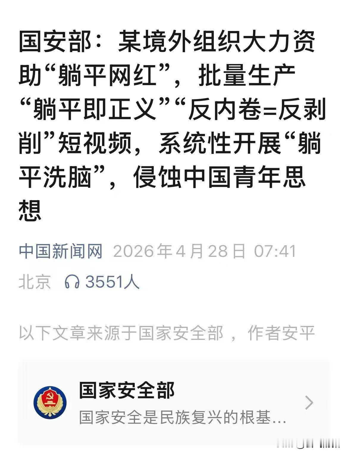 大家警醒啊!你刷到的每一条“躺平即正义”“摆烂才是解脱”的视频,全是境外反华势力布下的意识形态陷阱!这不是什么情绪共鸣,而是赤裸裸的思想渗透,专门针对我们年轻人,用心何其歹毒! 综合环球网等媒体报道,境外敌对组织明目张胆资助躺平网红,大批量炮制消极短视频,系统性对我国青年开展洗脑攻势。他们刻意放大生活焦虑,歪曲解读社会发展问题,疯狂散播“努力无用、奋斗吃亏”的扭曲言论,把个体压力恶意拔高成群体对立,一步步蚕食年轻人的奋斗意志,妄图瓦解我们的民族精气神! 更让人震怒的是,这就是彻头彻尾的双标骗局!他们一边拼命煽动我们青年躺平摆烂、放弃进取,让我们安于现状、不思进取; 另一边却紧锣密鼓推出各类人才计划、发展振兴工程,高薪抢夺全球顶尖人才,铆足全力拼发展、抢机遇!他们自己绝不躺平,却一心想让我们的青年彻底躺平,就是要我们错失发展良机,亲手葬送民族未来,这波阴谋昭然若揭! 一定要看清,这从来不是简单的网络论调,而是刺向青年的软刀子!青年是国家的未来,一旦年轻一代失去斗志、选择躺平,谁来攻克科研难关? 谁来扎根基层建设?谁来扛起民族复兴的重任?这种消极思想,看似温柔无害,实则在慢慢摧毁我们的价值根基,危害触目惊心! 千万别被伪命题困住!不参与无意义内卷,从来不等同于彻底摆烂!我们可以拒绝过度消耗,但绝不能放弃努力、放弃成长。 立足自身、脚踏实地,在自己的岗位上深耕发力,用实干创造价值,这才是当代青年该有的姿态,绝不能被境外杂音带偏方向! 当代青年必须擦亮双眼,保持独立思考,坚决抵制消极洗脑,不盲从、不信谣、不被裹挟!一时的躺平只能换来短暂安逸,却会错过人生无限可能;一味的逃避解决不了任何问题,只会离理想越来越远! 青春逢盛世,奋斗正当时!拒绝躺平陷阱,冲破思想迷雾,以昂扬姿态奋力拼搏,把青春热血融入强国征程,才不负时代、不负韶华! 你刷到过这类躺平洗脑视频吗?我们该如何坚守初心、抵制消极?评论区留言,转发让更多年轻人看清真相!