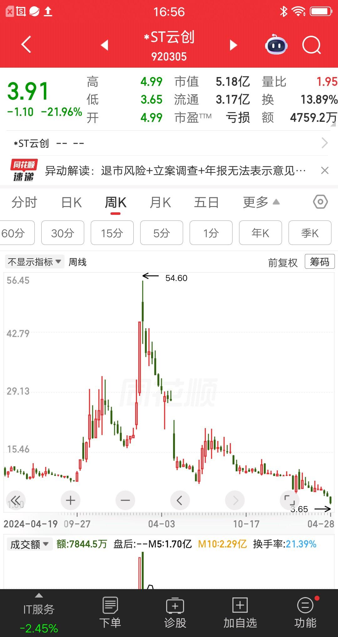A股今天最惨的票诞生了,股价跌没了90%,今日再度大跌30%,就问你们惨不惨?该票开盘后震荡走低,跌幅慢慢扩大,后面干脆不装了,任由股价跳水杀跌,盘中最大跌幅约30%。日线看更惨烈,从高点54.6元跌到3.91元,暴跌近93%。公司存在重大违法强制退市风险,年报被出具非标意见,不出意外退市板上钉钉了。 难以想象,有多少股民在这票上亏麻了,真的太惨了。