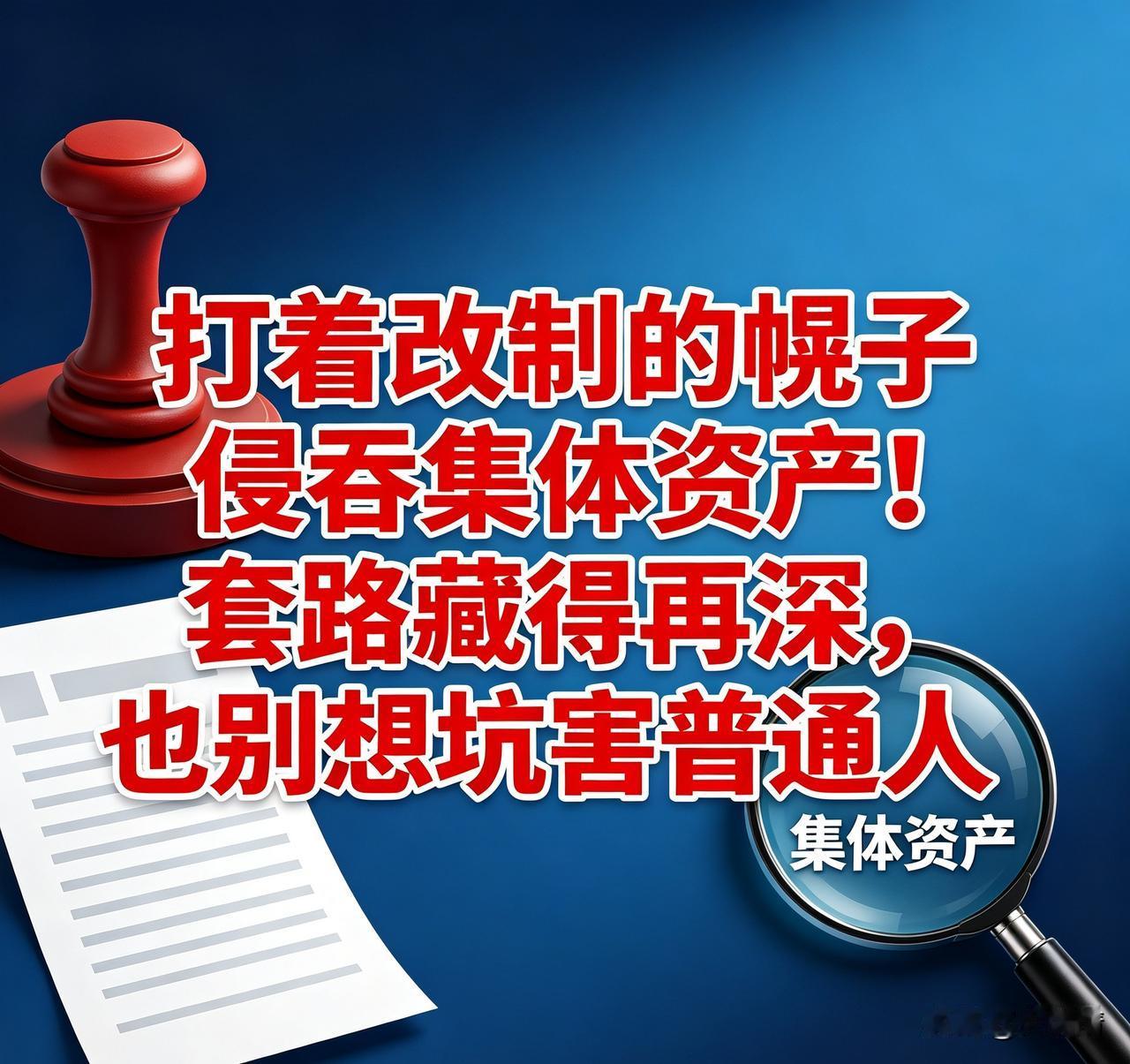 打着改制的幌子 侵吞集体资产! 套路藏得再深,也别想坑害普通人 原本利国利民的改制,如今却成了部分人眼里的“捞钱工具”,这绝非个例!不管是农村集体资产改制,还是老企业转型改革,初衷都是盘活资源、惠及大众,可偏偏有蛀虫钻空子,把好好的改革,变成了瓜分集体家底的黑幕。 细数这些人的龌龊手段,简直让人愤怒!农村集体土地、厂房、商铺,被刻意低价评估,再通过虚假流程、暗箱操作,悄无声息转到私人名下;老厂子改制全程封闭操作,资产估值、员工安置、债务清算全不公开,普通职工毫不知情,一觉醒来就面临失业、待遇骤降,连基本保障都没了。 他们满嘴政策大义,张口闭口为了发展,实则披着合法程序的外衣,行侵吞集体财产之实,把众人辛苦打拼的共同财富,揣进自己的腰包。而最无辜的普通人,没话语权、没监督渠道,只能眼睁睁看着集体资产被掏空,成为这场违规操作的唯一买单者。 好在国家始终重拳出击,严查农村“三资”乱象、整治改制违规行为、追讨被侵占资产,一大批贪腐蛀虫纷纷落马,被侵吞的集体财产陆续追回,给了老百姓最坚实的依靠。 真正的改制,从来不是少数人说了算,必须全程公开透明、保障群众知情权、优先维护普通人利益。集体资产是全民家底,绝非私人蛋糕,任何想借改制谋私利的行为,终究难逃法律制裁! 集体资产清查