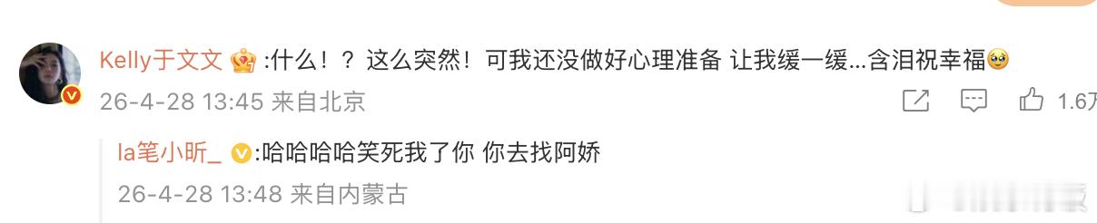 于文文被蔡卓妍结婚吓一跳于文文含泪祝幸福蔡卓妍 阿sa结婚把于文文本体吓出来了 评论:“什么!?这么突然!可我还没做好心理准备 让我缓一缓…含泪祝幸福🥹”,看得出来真的很震惊也很为啊sa开心了