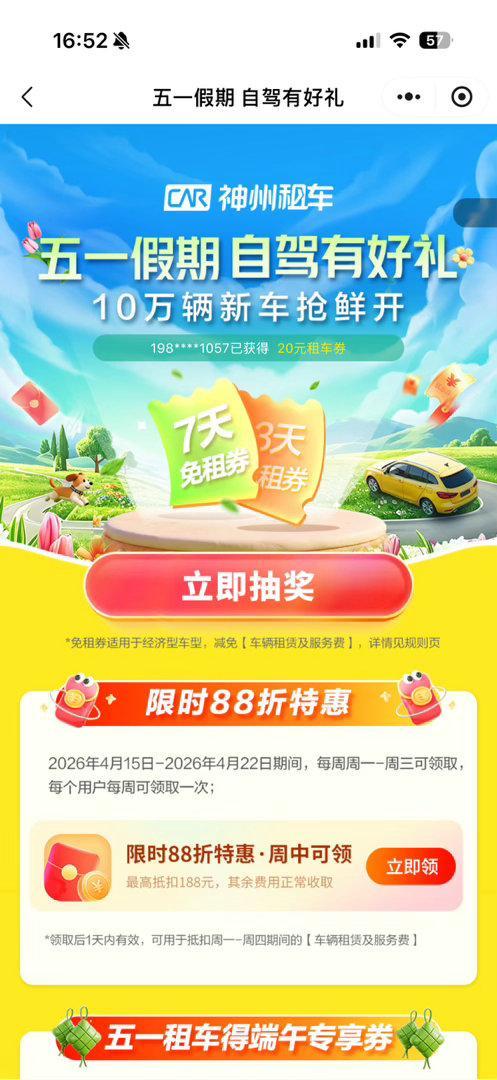 建议想减肥的人去一趟云南神州租车助力五一自驾游,十万辆新车抢先体验,福利同步上线。抽取免租好礼、叠加端午优惠券,上门取送一站式服务,自在出发畅游云南。