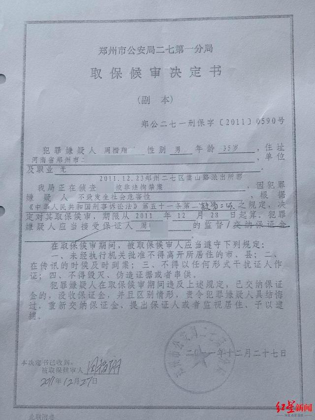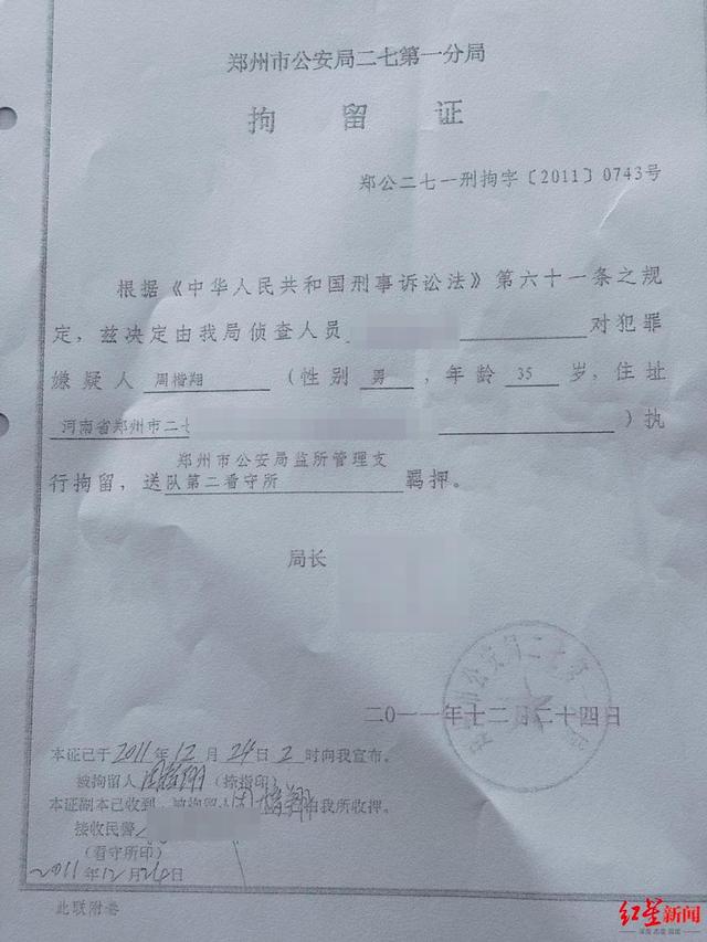 红星新闻记者获得的2011年郑州市公安局二七第一分局拘留证显示,周楷翔于2011年12月24日被送至郑州市公安局第二看守所羁押。另一份当年12月27日的取保候审决定书显示,因为周楷翔不致发生社会危害性,决定对其取保候审。